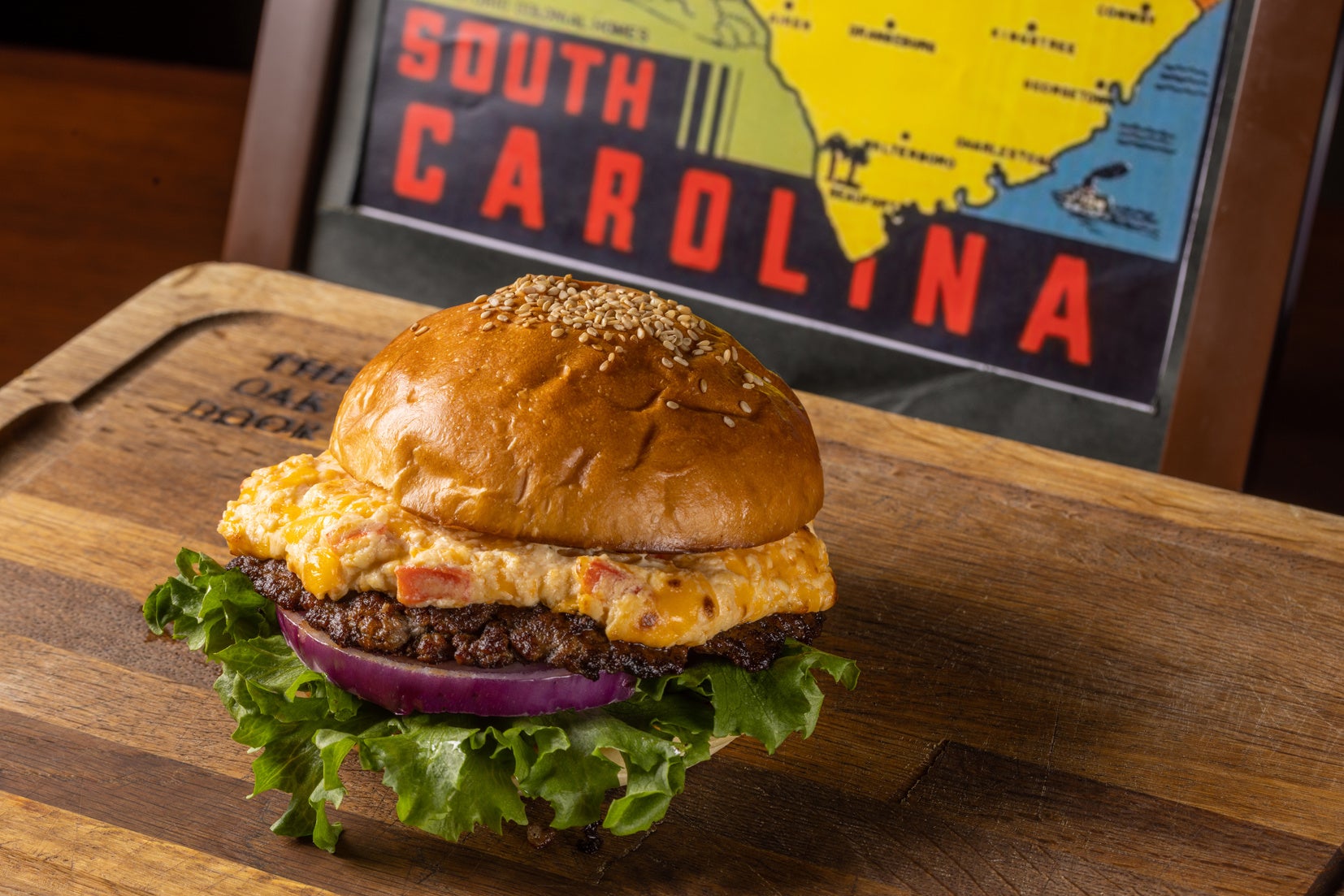 アメリカをバーガーで巡る旅の終着地は、大西洋に面したサウスカロライナ州。鉄板の上で押さえ焼きしたスマッシュビーフパティにチェダーチーズ、クリームチーズ、ペッパーのピクルスで作った「カロライナ・キャビア」とも称されるピメントチーズをたっぷりと乗せました。食べ応えのあるビーフパティにも引けを取らない具材が決め手の一品です。