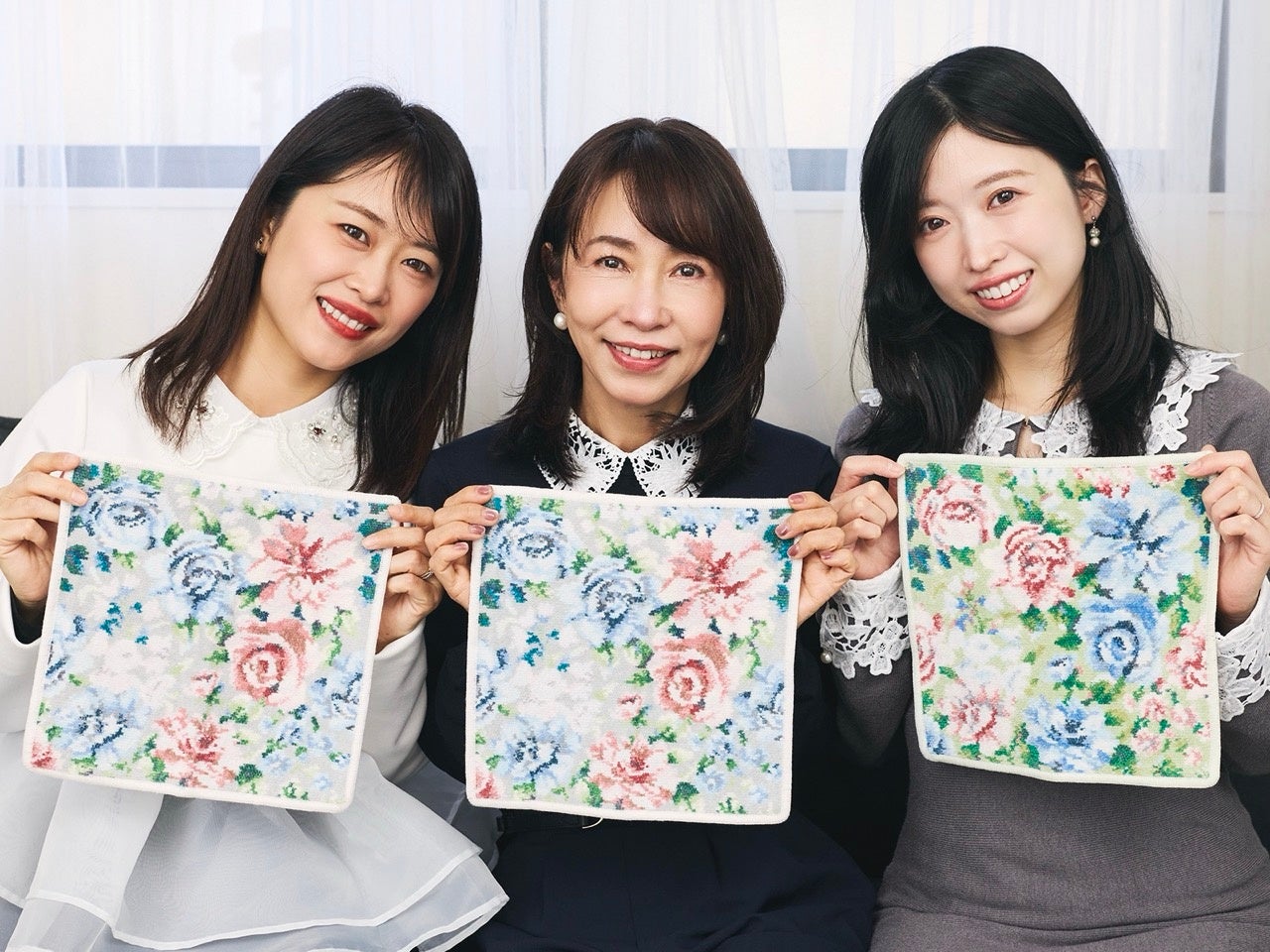 普段、お三方ではどんなフェイラートークをされているのでしょうか?「お出かけ先で食事をするときにフェイラーのハンカチを膝にのせていますが、『あ、今日はそれにしたんだ』みたいな会話をよくします」とユリエさん。「これはユズちゃんにもらったの、とか言ってね」と楽しそうなお母様。一緒にお買い物にも行かれるそうで、つい最近もユリエさんとお母様でジェイアール名古屋タカシマヤのショップに足を運んでくださったとのこと。「フェイラーはお店に行っただけでも、そこがパワースポットみたいな感じで(笑)、気分が上がります。自分が好きなものがずらりと並んでいて、きれいな色ばかりでお花畑みたいですよね」とユリエさん。この日はユリエさんの旦那様もご一緒くださり、「ハンカチはフェイラーしか買いません!」とうれしいコメントをいただきました。