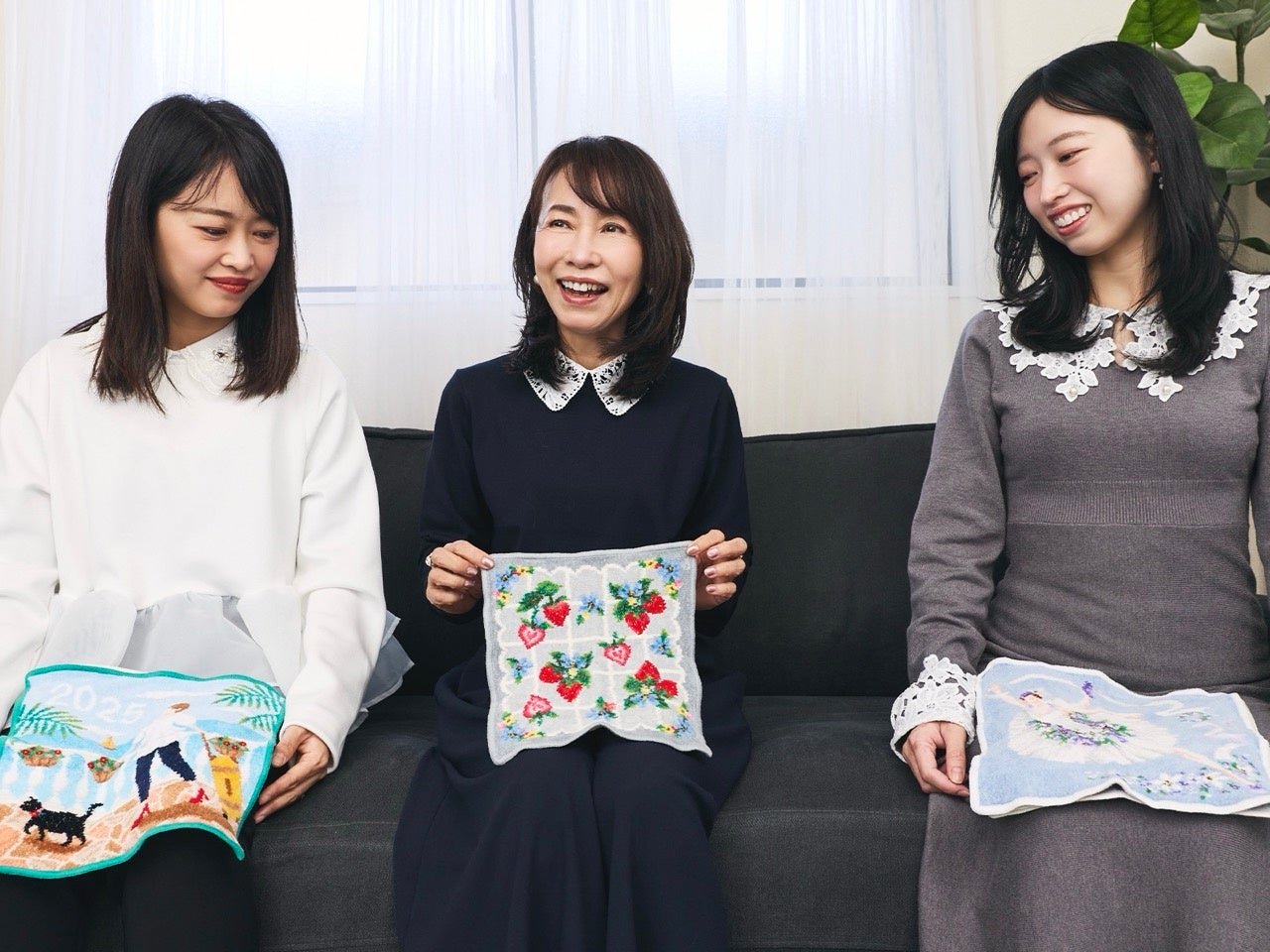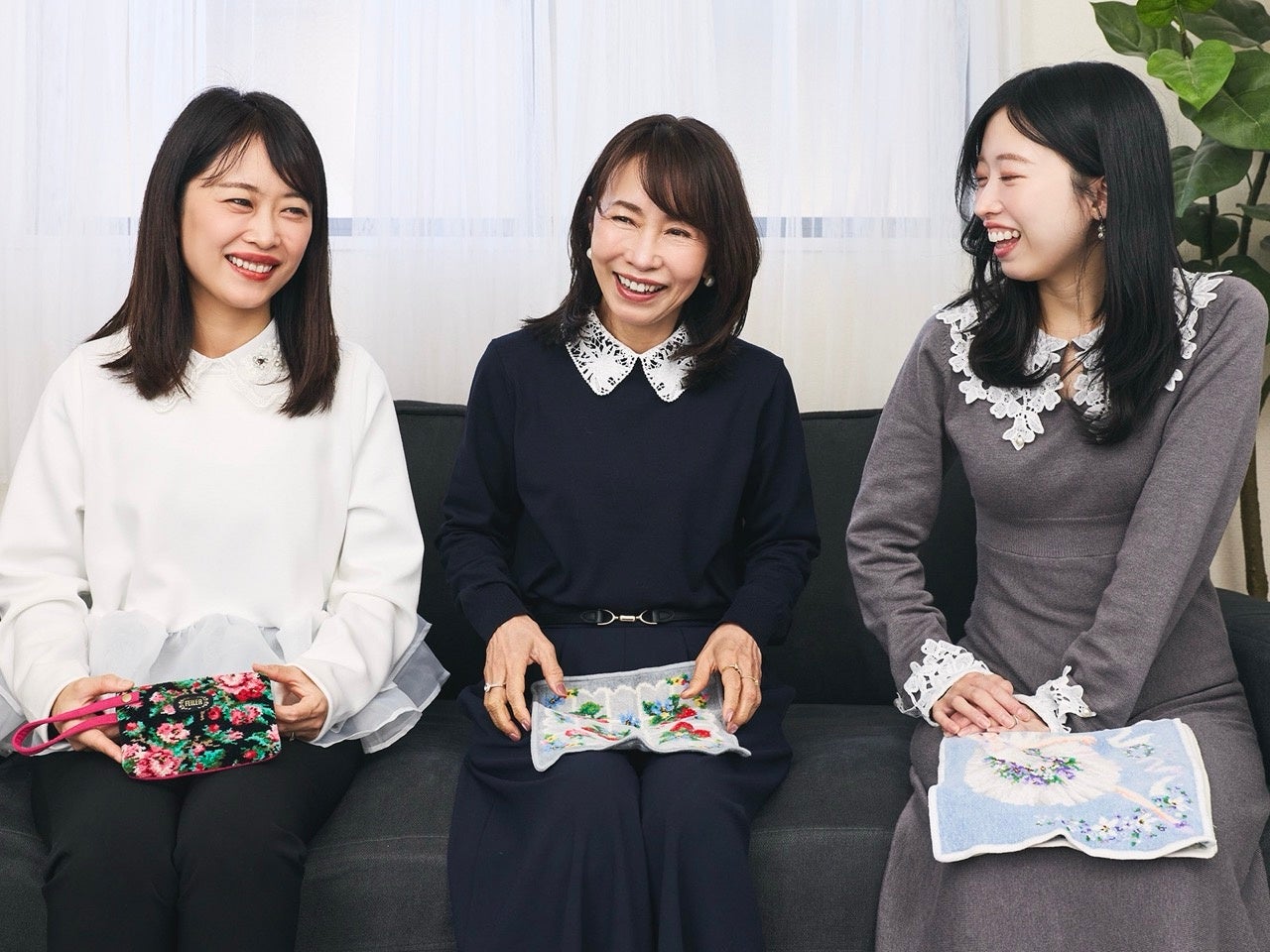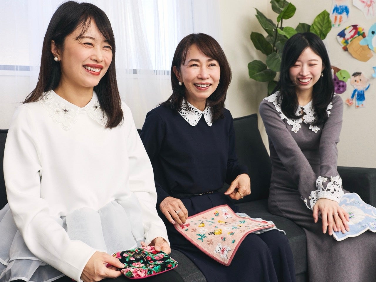 では最後に、お三方にとってフェイラーはどんな存在ですか?「フェイラーのハンカチを大切な人に贈るとき、その人のことを思い浮かべて、つながりを感じることができますよね。1枚のハンカチに大切な人への感謝や愛を込めることができますし、それを受け取ることもできる。軽くて、やわらかくて、肌ざわりがよくて、ぬくもりが感じられる。そんなほんわかした雰囲気が、私の中のフェイラーのイメージです。家族の絆を深めてくれる存在で、幸せの象徴という感じがしますね」とお母様。「家族をつないでくれるものです。今、生きている私たちのつながりでもありますし、祖母から受け継いだ世代のつながりもあります」とユリエさん。そしてユズさんはこう話してくださいました。「家族で同じブランドを共有できることがうれしいです。祖母、母、私たち姉妹と三世代の思い出の中にあるものであり、未来へとつながっていくもの。私の娘もすでにフェイラーデビュー済みですので、これから一緒に愛用していきたいと思っています。フェイラーは私たち母娘にとって、特別なブランド。ずっと変わらず日常に寄り添い続けてくれる、かけがえのない存在です」。