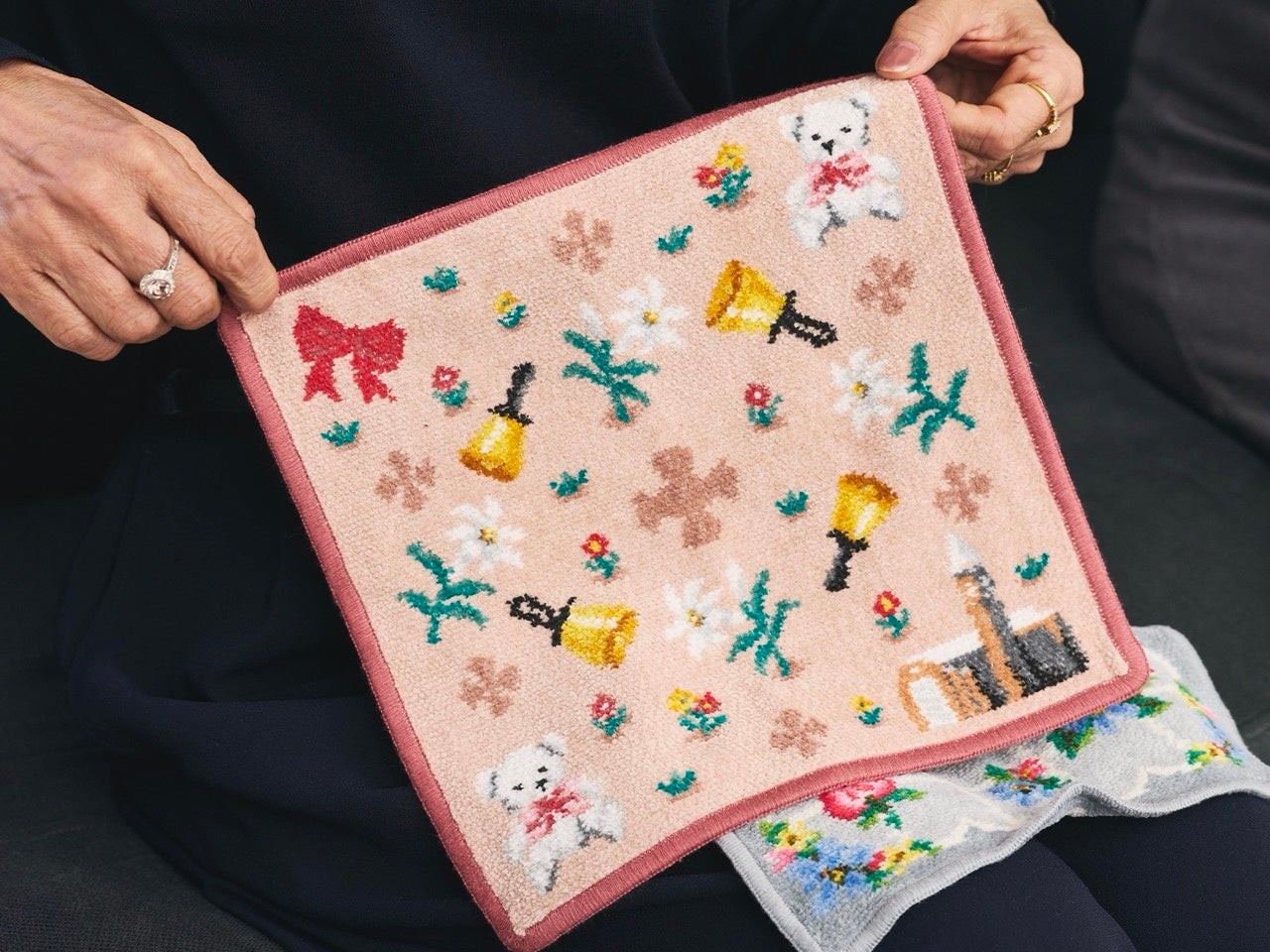 お母様とユリエさんはご出身校が同じで、母校とフェイラーのコラボハンカチをお揃いで購入されたそう。「知人に教えてもらって、娘と一緒に予約したのですが、自分が大好きなブランドと自分の出身校のコラボなんて、本当にうれしくて。私の母も同じ学校で、母校愛がすごく強かったので、『おばあちゃんもきっとほしいと言っただろうね』と2人で話していました」とお母様。「ハンカチに描かれているのは、学校にゆかりのあるものばかりです。校舎や有名なハンドベル、校章に使われている百合の花や十字、そしてクマちゃんは卒業のときにもらうテディベアと、卒業生ならわかるモチーフが使われています」とユリエさんが説明してくださいました。