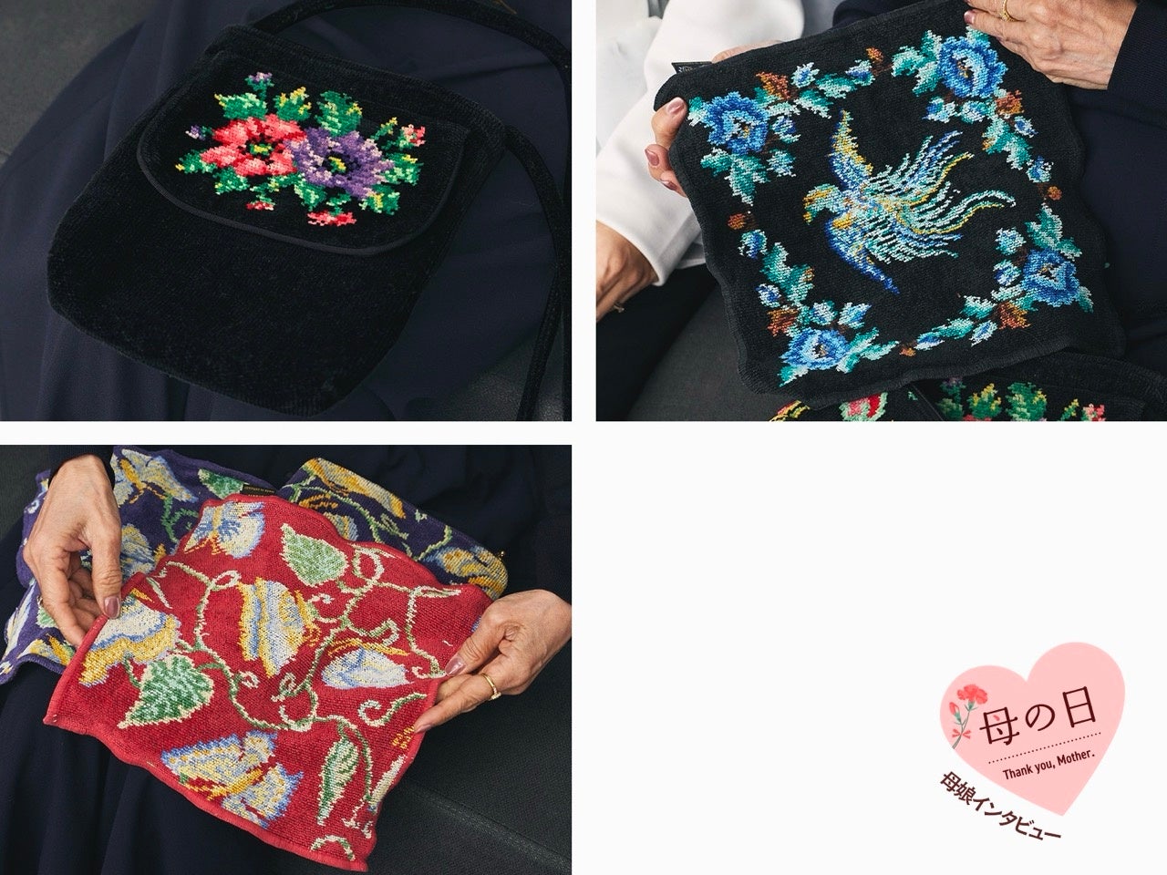 一方、お母様にはいつもお花を贈っているというユリエさん。バラをモチーフとしたフェイラーの『リアローズ』のポーチをプレゼントされたこともあるそう。「母はお花が好きで、特にバラが好きなので。還暦のときは旅先でバラの花を60本、サプライズで渡しました」。「娘たちがお祝いの旅行に連れて行ってくれて、まさかそんなことまでしてもらえるとは思ってもみなかったので、本当にありがたかったです」とお母様。お話を伺っていると、ご家族が記念日をとても大切にされていることが伝わってきますが、母の日はいつもどのように過ごしていらっしゃるのでしょうか?「娘たちが子どもの頃から今も、必ず何かプレゼントをもらっていて。大人になってからはそれに加えて家に集まって一緒にご飯を食べてという感じでした。今はそれぞれ家庭がありますので、集まるのがなかなか難しいこともあるのですが、だからこそ今日は本当にうれしくて。母の日のインタビューという機会をいただき、離れて暮らす娘ともこうして会えるなんて、すごく幸せです」。