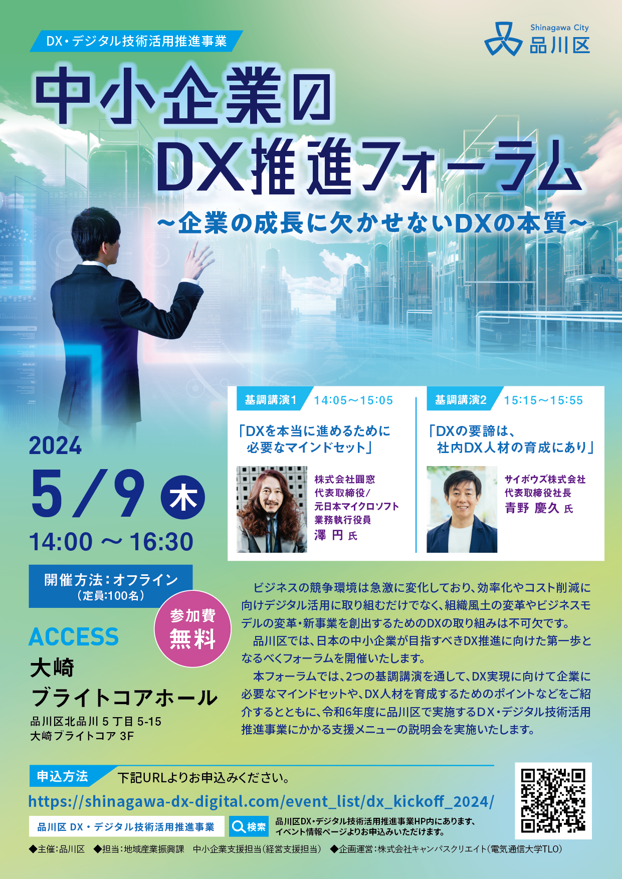 品川区では、2024年5月9日(木)に、日本の中小企業が目指すべきDX推進に向けた第一歩となるべくフォーラムを開催いたします。