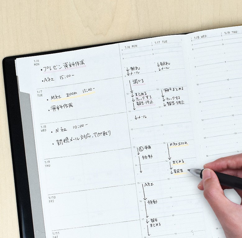 「WISELY(ワイズリー)」は、月間マンスリーページ、進捗管理用の月間TODOページ、そして週間バーチカルページで構成されており、特に週間バーチカルページでは、15分単位で予定を細かく管理できます。時間管理にこだわりたい人には、よりスムーズなスケジュール管理を提供し、時間管理が苦手な方にも「どれだけ時間を使っているか」を視覚化する習慣をサポートします。これにより、先延ばし癖を改善し、より効率的な時間管理を実現します。