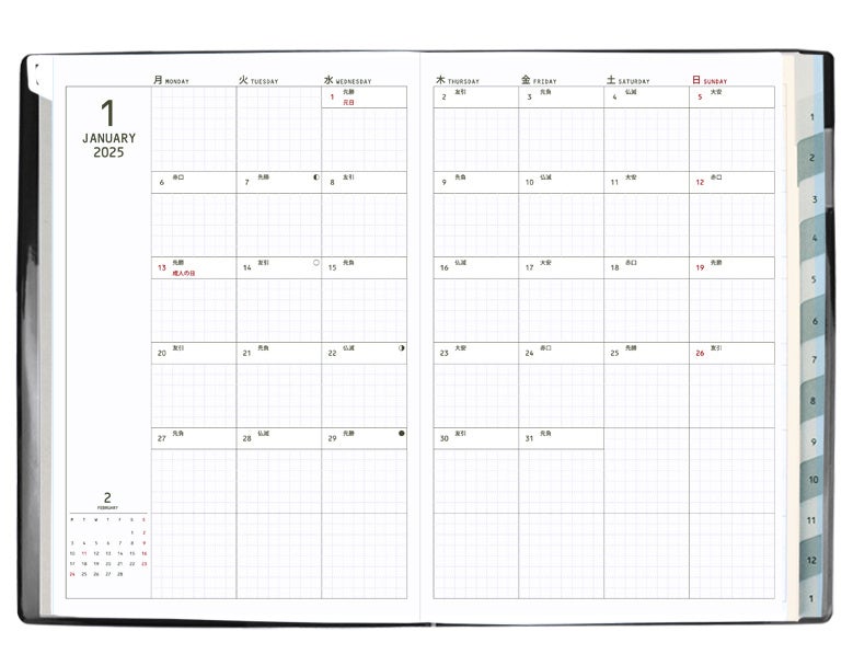 ・月間カレンダー(月曜始まり/方眼)