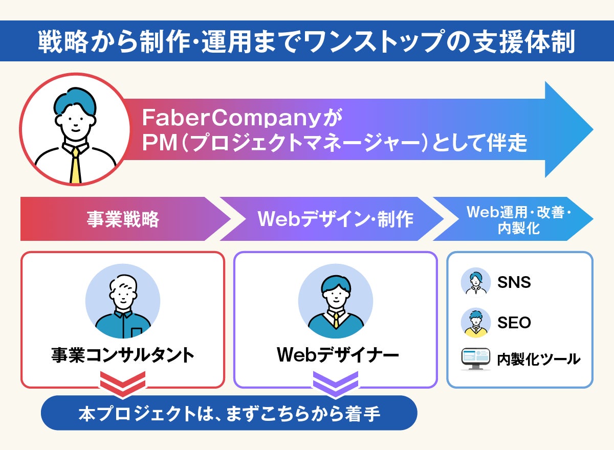 そこで、Faber Companyの「ミエルカコネクト」を活用した支援を導入。各領域の専門家からなるチームの編成により、事業戦略からサイトデザイン、制作、運用までを一気通貫で実施できるプロジェクト体制を構築することができました。