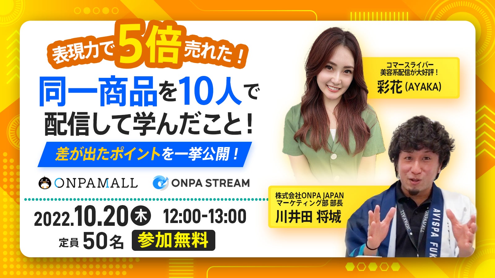 株式会社ONPA JAPAN(東京都渋谷区、代表取締役:恩地 佑亜 /以下、ONPA JAPAN)が定員50名限定で無料オンラインウェビナーを開催いたします。ライブコマースをご検討中、よりよいライブ配信の企画をお考えの企業様向けウェビナーです。