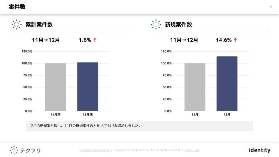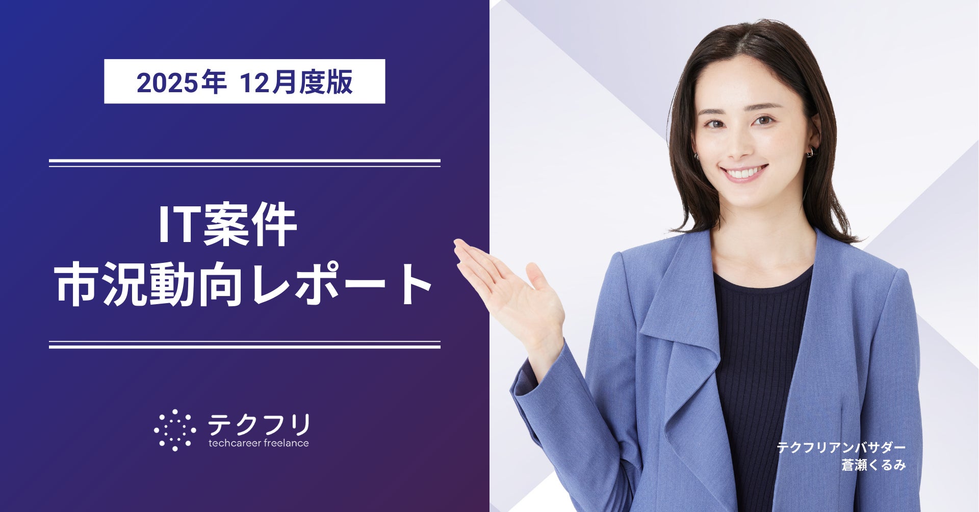 ITフリーランスエンジニアの案件・求人サイト「テクフリ」(https://freelance.techcareer.jp/)を運営する株式会社アイデンティティー(東京都港区、代表取締役:今野 力、以下「当社」)は、テクフリのデータベースをもとに2025年12月における案件の市況感を調査しました。より詳しい結果については、お問い合わせから資料請求が可能です。