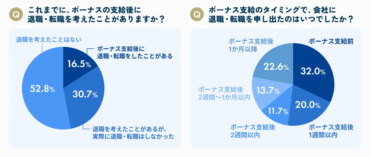 47.2%はボーナス支給のタイミングで退職・転職を考えたことがある、もしくは実際に退職・転職をしたことがあると回答した