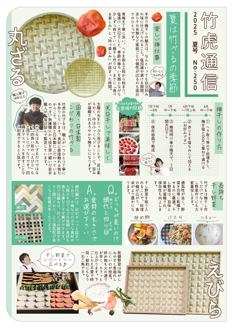 「竹虎通信2025年夏号」が完成しました!今回の特集は梅干しや干し野菜づくりに活躍する「竹ざる」。フードロス解消にも役立つ、職人手作りの国産竹ざるの魅力や、用途に合わせた選び方をご紹介しています。