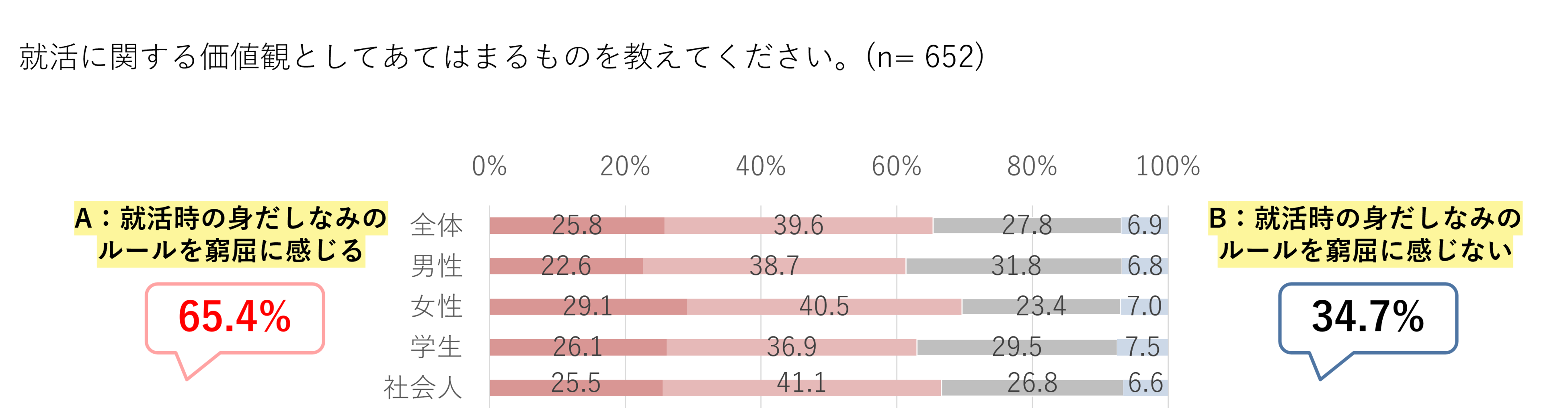 SHIBUYA109 lab.とワンキャリア両社が実施した調査結果から、現在の就職活動やキャリア形成において、窮屈さを感じていることが明らかになっています。SHIBUYA109 lab.が652名の就職活動を経験したZ世代に実施した調査では、65.4%が「就活時の身だしなみのルールを窮屈に感じる」と回答しています。また、ワンキャリアの学生を対象とした調査でも、62%が「不採用への不安から、面接において実際の本音や事実と異なる発言をしたことがある」(n=312)、と回答しています。
