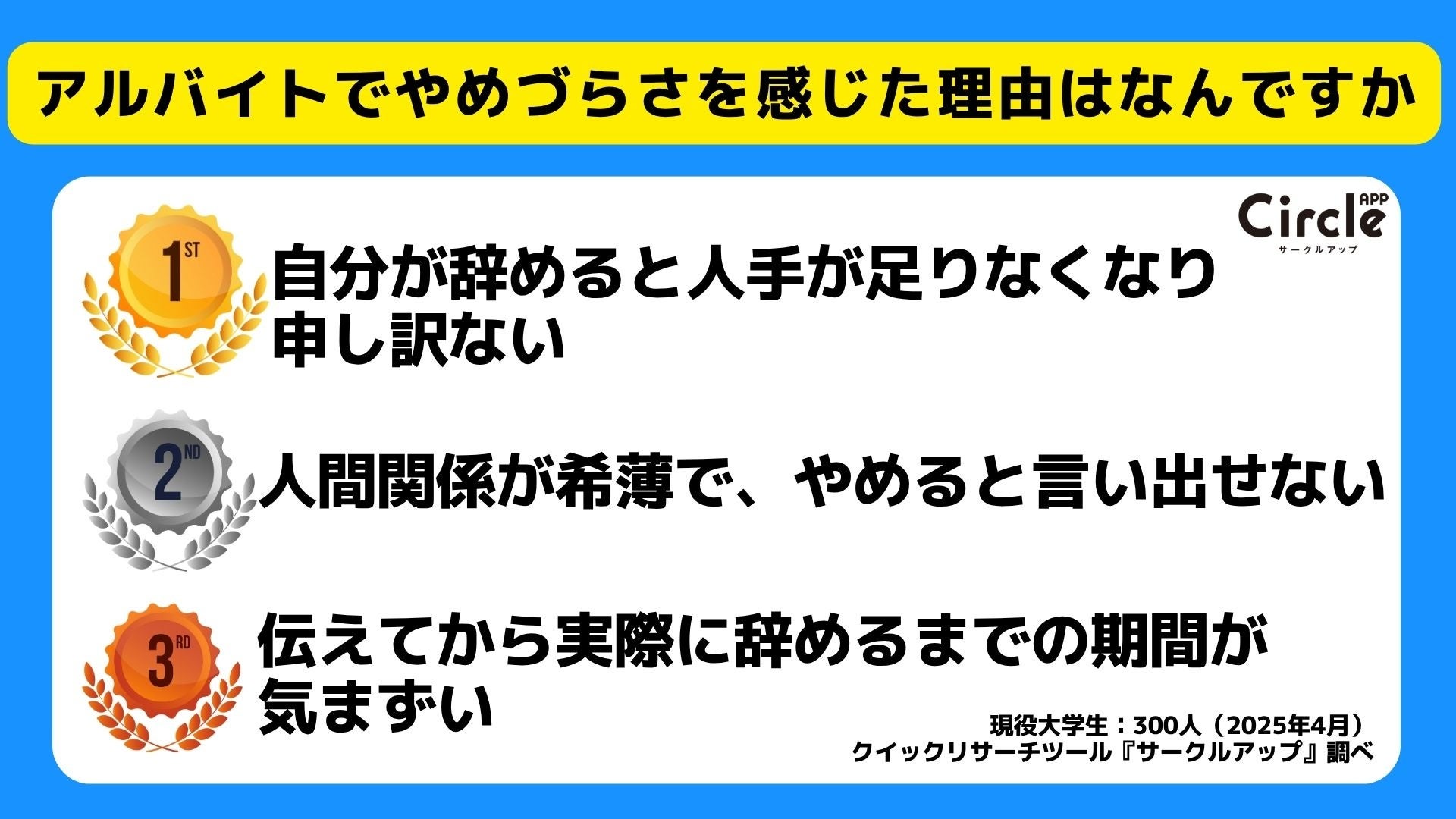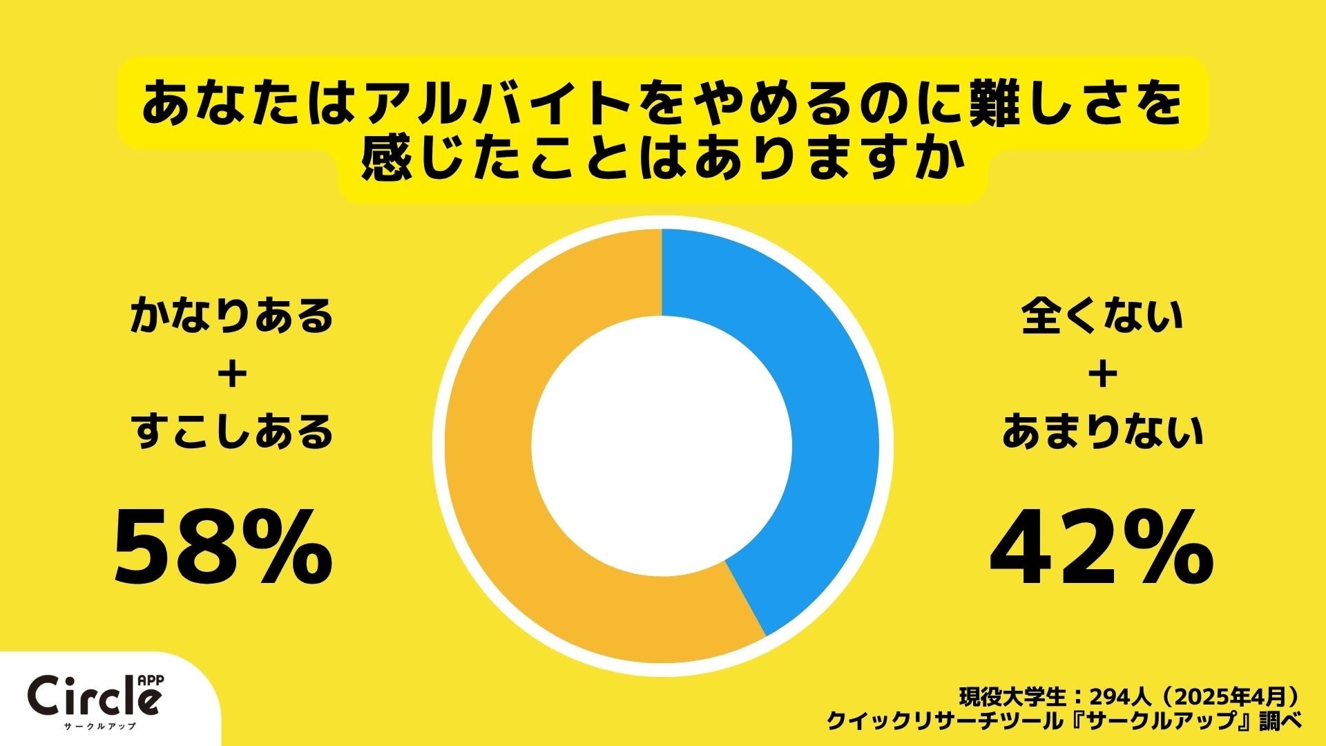 アンケート結果によると、アルバイトをやめることに難しさを感じたことがある学生は全体の約6割。その理由としては以下のような声が多く挙がりました。