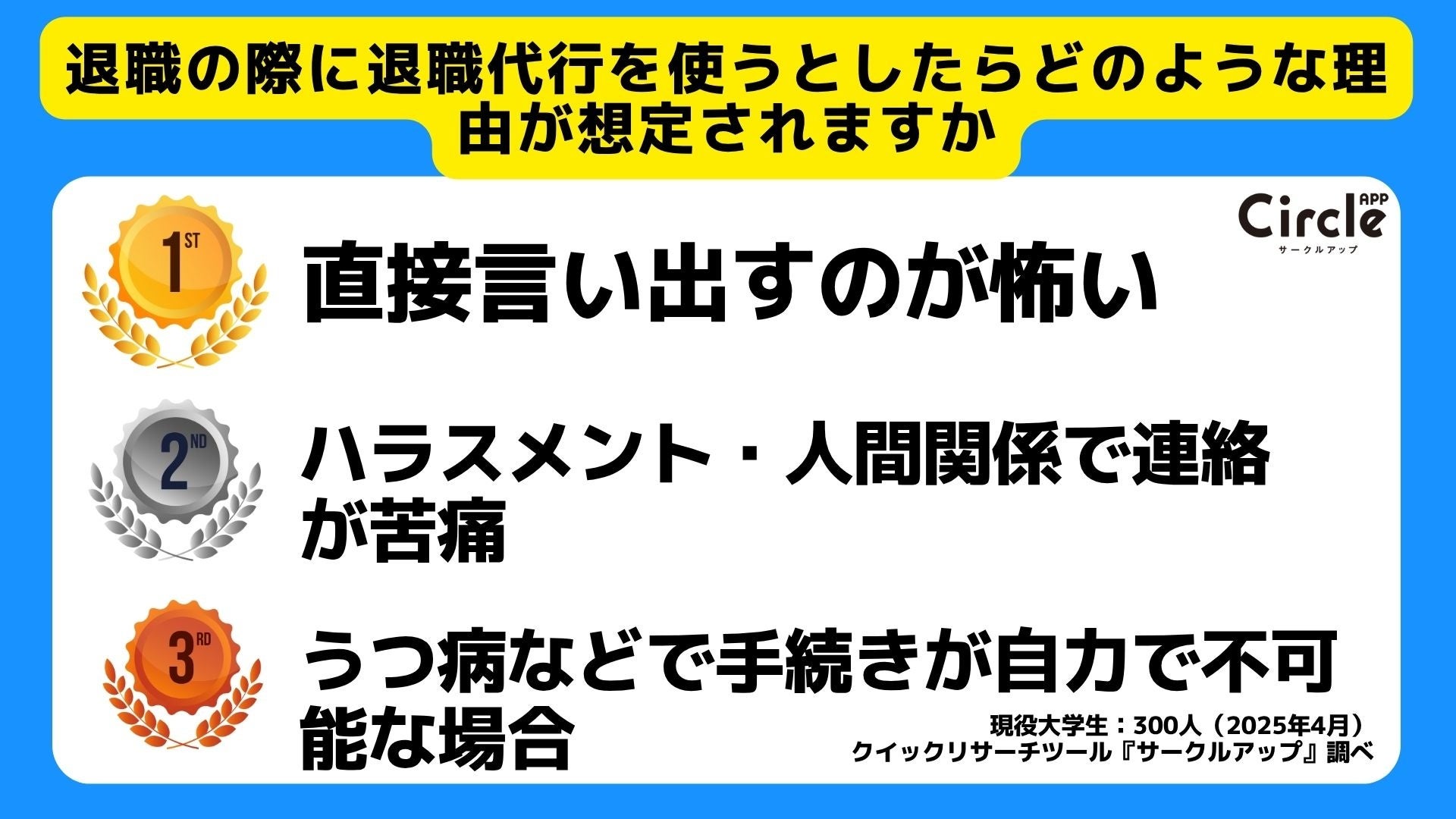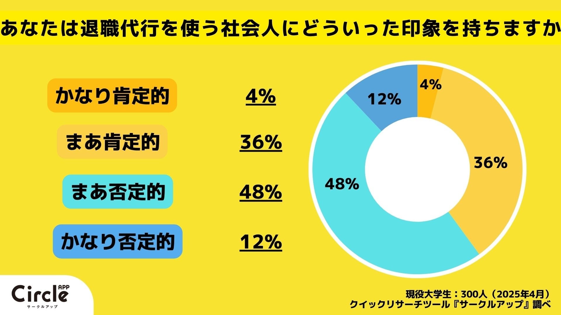 社会人の間で利用が広がる「退職代行サービス」。自分で退職を言い出しにくい場面をサポートするこの仕組みについて、将来の利用者になるかもしれない現役大学生たちはどう感じているのでしょうか。アンケート結果がこちらです。