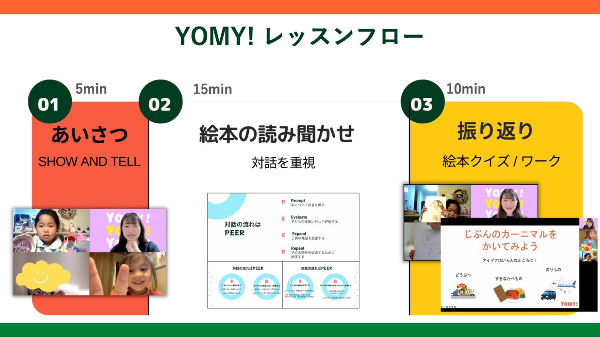 YOMY!は、 子供の成長にかかせない”人とのコミュニケーション”と、いつの時代も最高の教材である”絵本の読みきかせ”をかけあわせたオンライン読み聞かせスクールです。