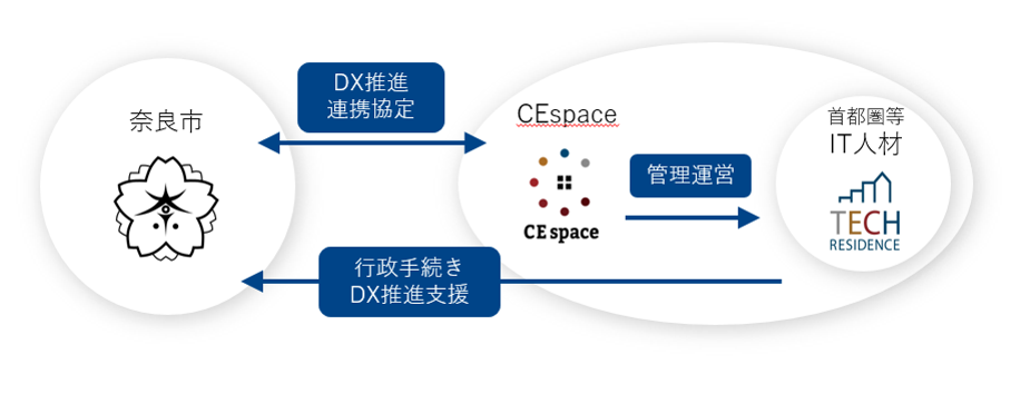 本協定では、奈良市のDX推進に向けた外部支援として、CEspaceが運営するIT人材に特化したコミュニティ型賃貸住宅「TECH RESIDENCDE(テックレジデンス)」入居者ほか、関係するTECH人材(ITコンサルタント、ITエンジニア、アプリケーション開発者、プロジェクト管理者等)の知見を活用するものです。