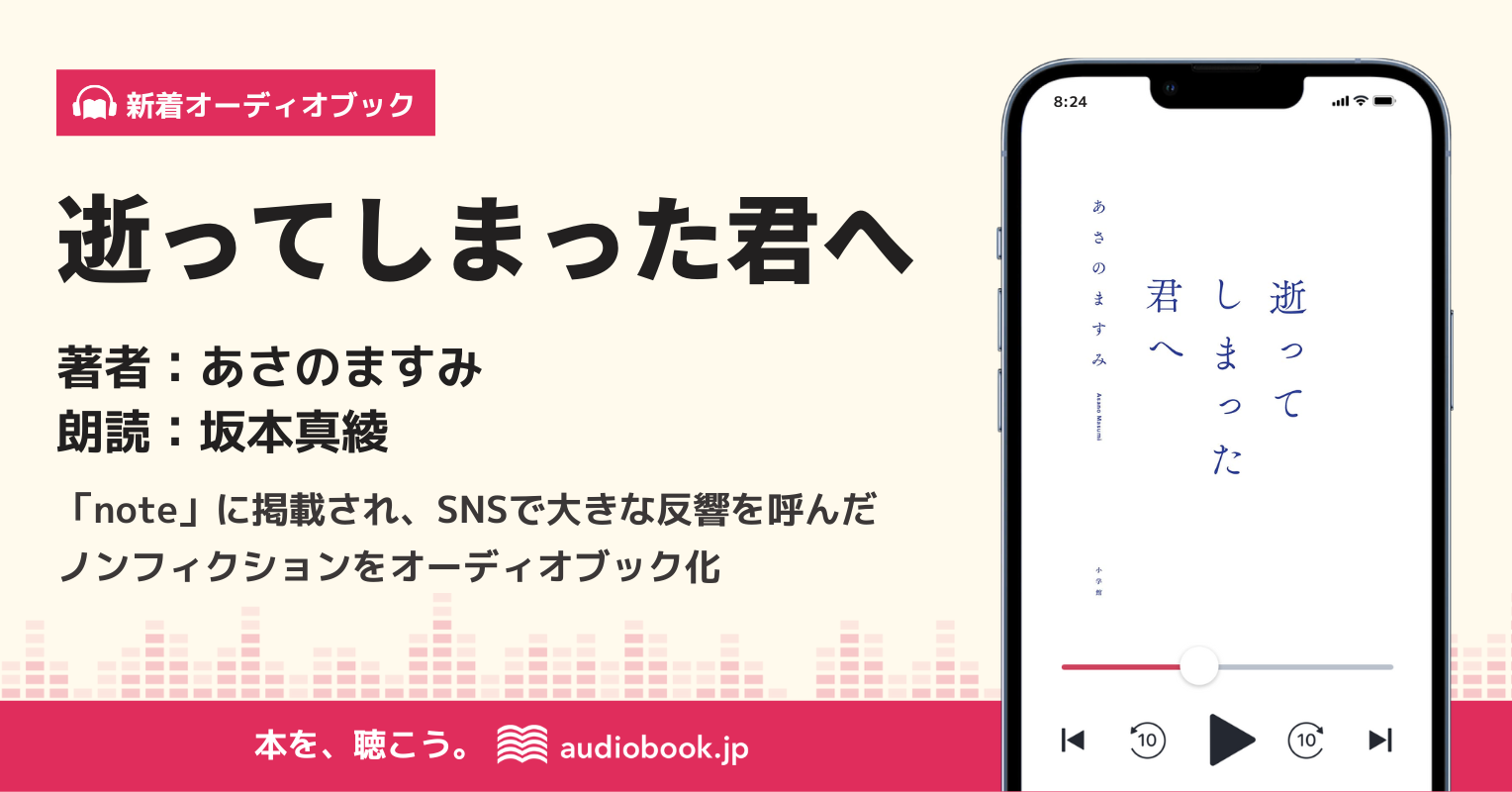 日本一のオーディオブック書籍ラインナップ数(※)を配信する「audiobook.jp」を運営する株式会社オトバンクは、2020年に「note」で掲載され、SNSで大きな反響を呼んだノンフィクションの書籍『逝ってしまった君へ』(あさのますみ著、小学館刊)を音声化し、2022年5月17日(火)よりオーディオブックで配信開始いたします。オーディオブック版は、声優・坂本真綾が全編を朗読し、同じく声優である著者が真摯に綴ったエッセイを音声でお届けします。※日本マーケティングリサーチ機構2021年11月調べ。日本語オーディオブック書籍ラインナップ数調査。