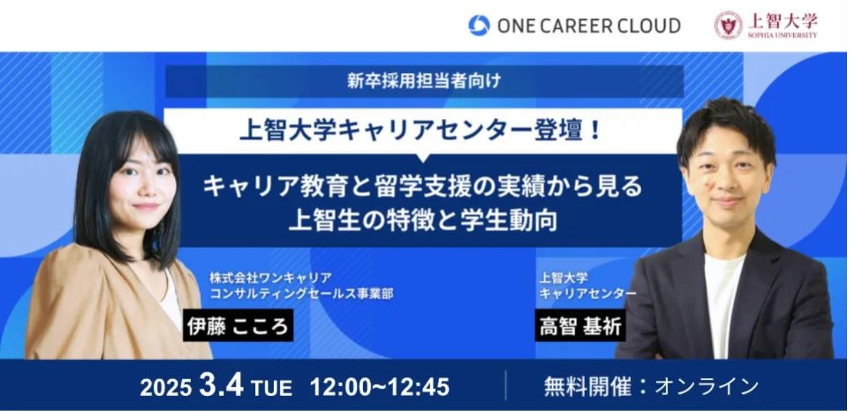 人事向け採用クラウド「ONE CAREER CLOUD」を展開する株式会社ワンキャリア(本社:東京都渋谷区、代表取締役社長 執行役員CEO:宮下 尚之、以下ワンキャリア)は、上智大学キャリアセンターと共に新卒採用担当者向けセミナー「キャリア教育と留学支援の実績から見る上智生の特徴と学生動向」を2025年1月28日(火)に開催しました。本レポートでは、その内容を一部抜粋して紹介します。