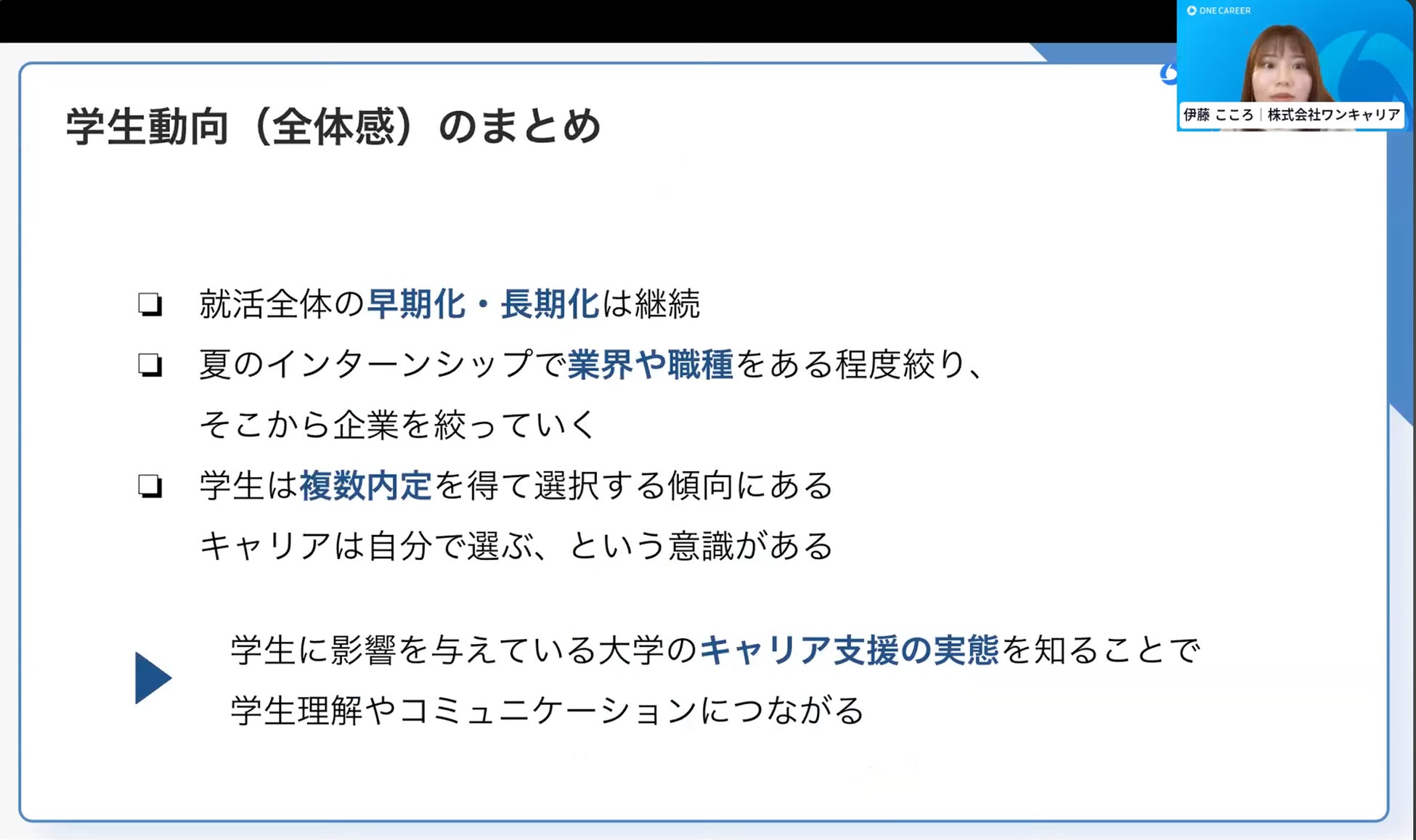 まず、当社セールスコンサルティング事業部の伊藤こころより、アンケート調査から読み解く学生全体の動向について解説しました。
