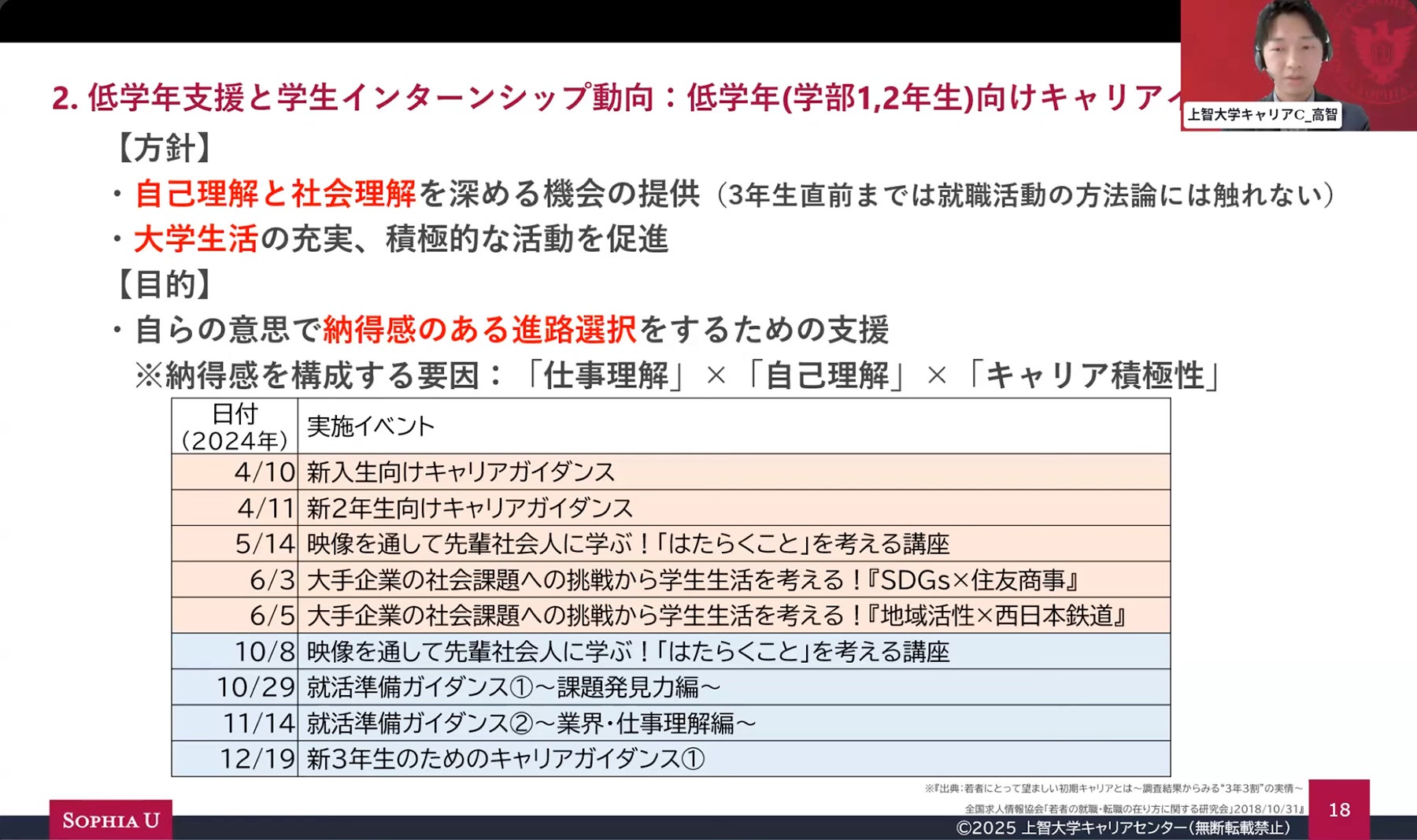 上智大学では、1・2年生を対象に「大学での経験と社会での活用の接続」の意識を高めるキャリアイベントを多数開催しています。自らの意思で納得感のある進路選択をするための支援を目的に、仕事理解・自己理解・キャリア積極性をテーマにしたガイダンスには、2学年の就職者約6,000名のうち5〜6人に1人が参加しており、低学年のキャリア意識は年々高まっている傾向について説明しました。
