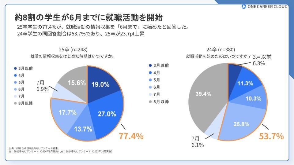 就職活動の情報収集開始時期について、「25卒の約8割の学生が大学3年の6月までに就職活動を開始」し、24卒と比べて早期化・長期化の傾向が高まっていること、内定獲得数については半数以上の学生が複数社の内定を獲得している状況であるとデータを基に説明しました。