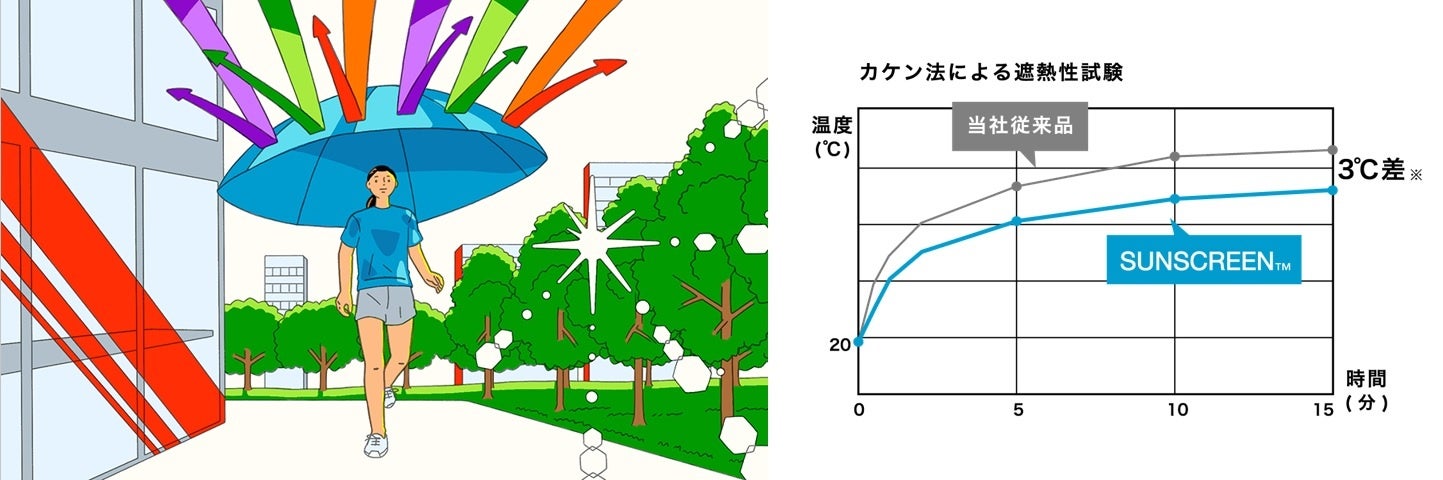 ※1:カケン法に基づく遮熱性試験における当社従来品とサンスクリーンの温度差。実着用では環境によって数値は異なります