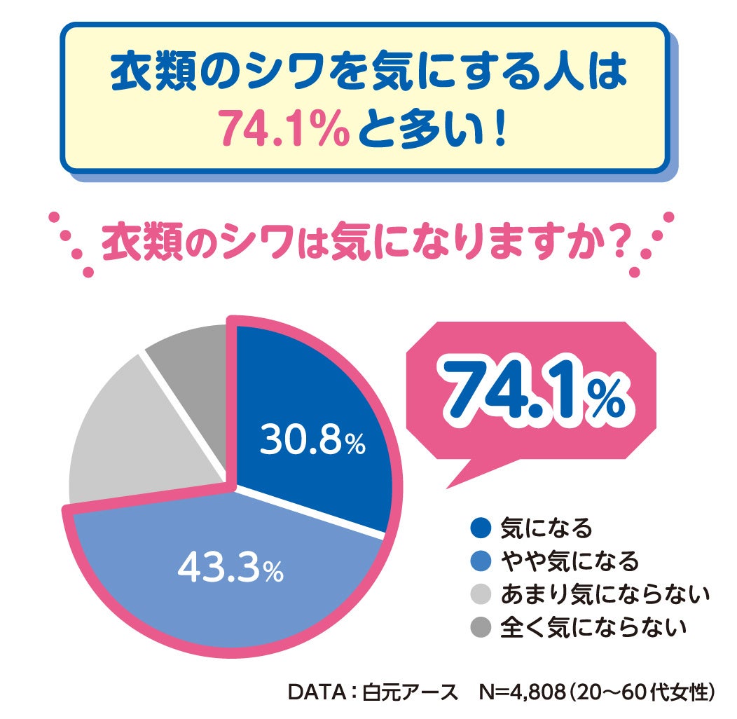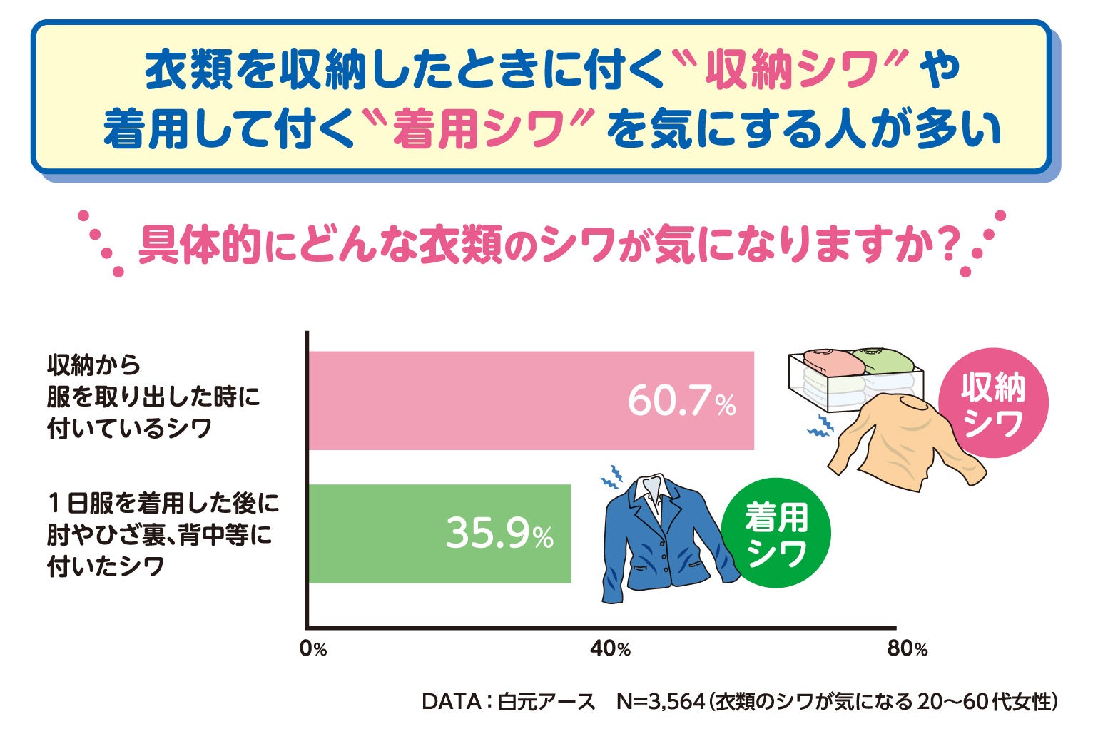 衣類のシワを気にする方は多く、今回当社が独自に調査したところ、7割以上の方がシワを気にしていることが分かりました。また具体的な気になる衣類のシワとして、衣類を収納した時につく“収納シワ”や衣類を着用した時につく“着用シワ”を挙げる方が多いことも分かりました(下図参照)。