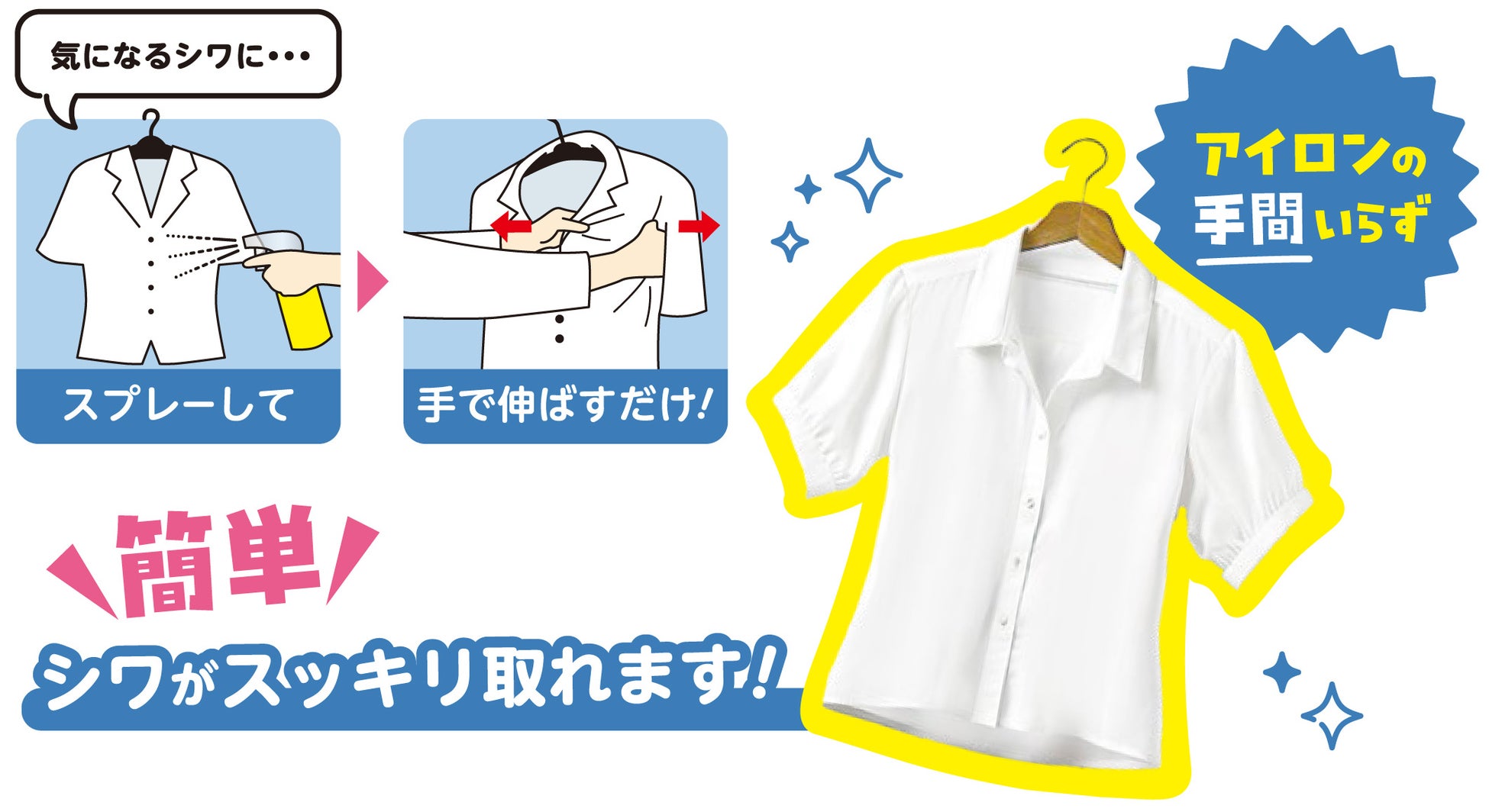 ●一日着た衣類のシワや収納時にできたシワにスプレーして手で伸ばすだけでスッキリとれます。