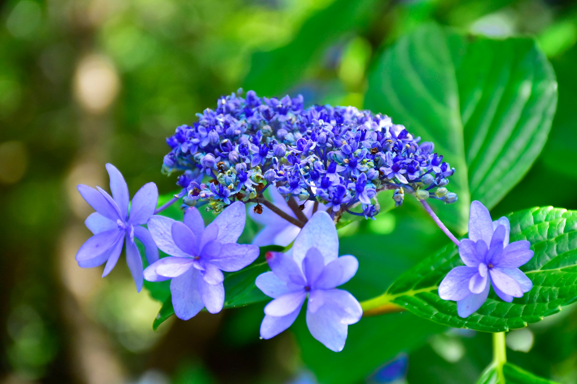 城ヶ崎海岸に自生する八重の額アジサイ。紺青の両性花が美しい