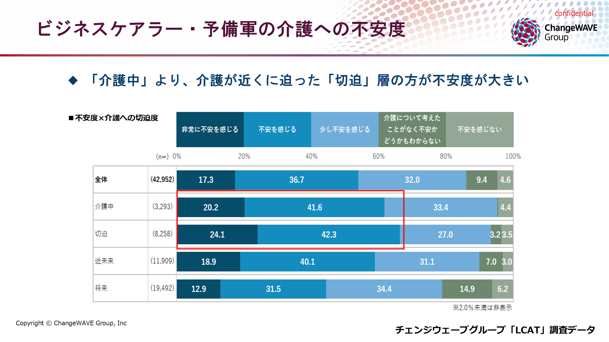特に介護“予備軍”の不安は現在介護中の方の不安を上回り、制度の整備と職場の理解が鍵であることが示されました。
