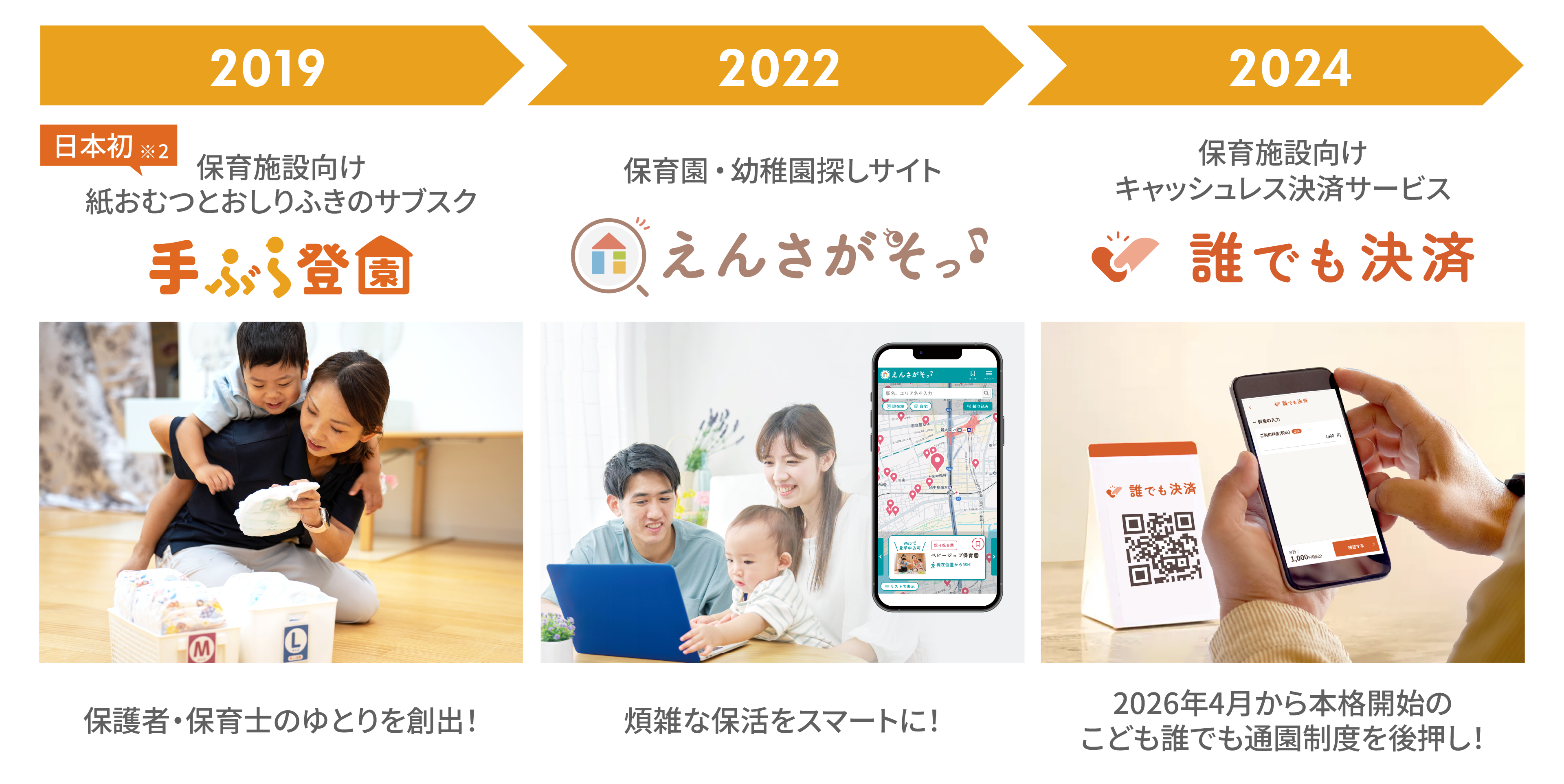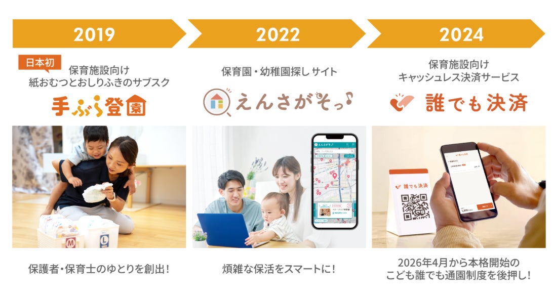 すべての人が子育てを楽しいと思える社会を実現するために、保育施設向けの紙おむつとおしりふきのサブスク「手ぶら登園」などを中心に、子育てに関する社会課題の解決に取り組む会社です。