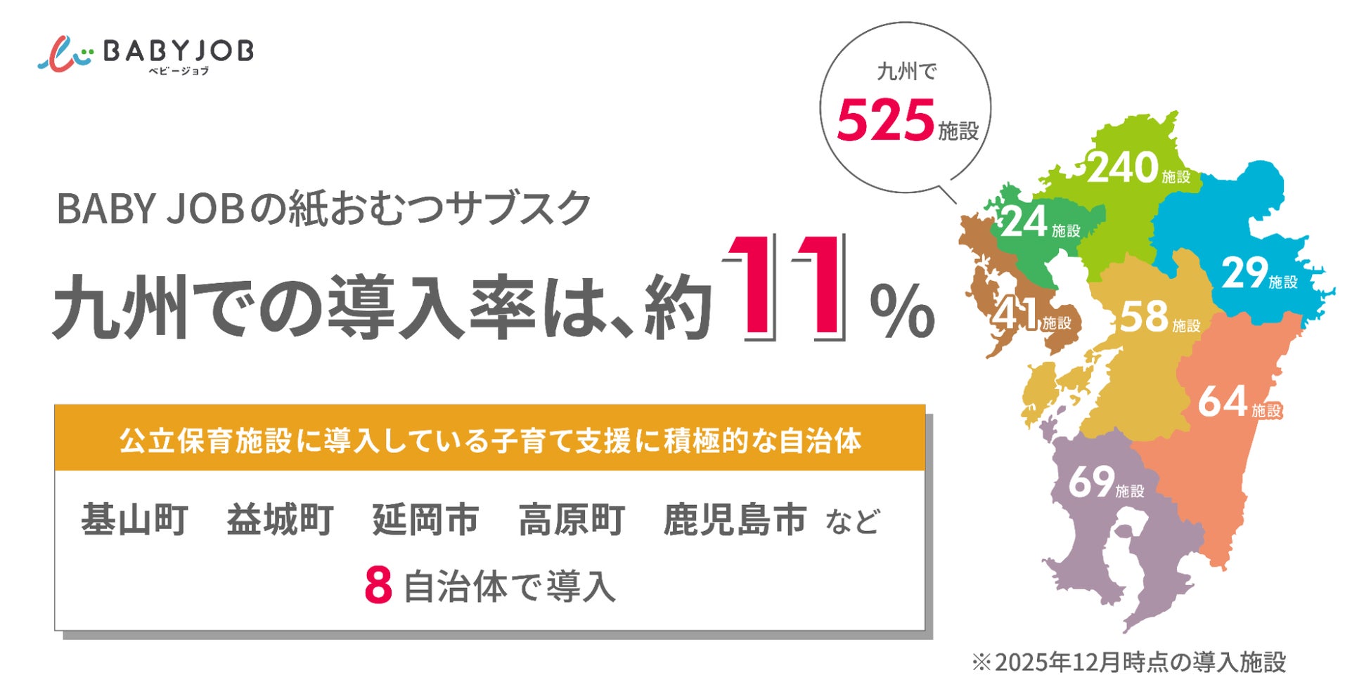 九州におけるBABY JOBの紙おむつ・おしりふきサブスクの導入は、現在525施設(11.0%※1)にとどまっており、自治体との連携も8自治体に限られています。