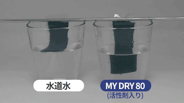 MYDRY80は中性洗剤の洗浄力の弱さを油性と水性の活性剤を効率よく使用し衣類繊維の奥まで洗剤を浸透させて汚れを浮かせてしっかり洗浄します。