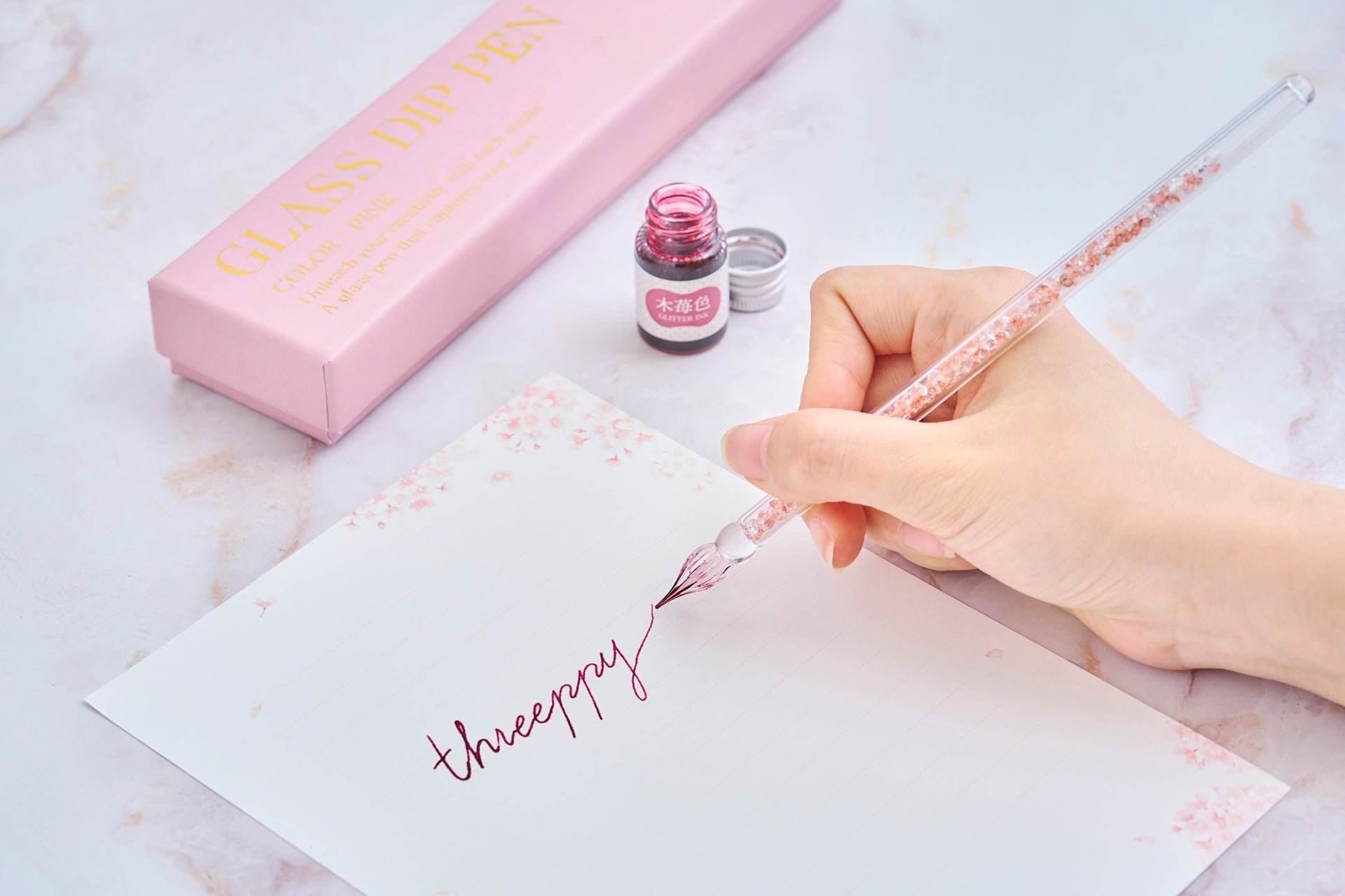 THREEPPYでは華やかなラインストーン入りのガラスペンやラメ入りのインクを、気軽に手に取りやすい価格帯で展開し、文字と向き合う、幸せなひとときを提供します。