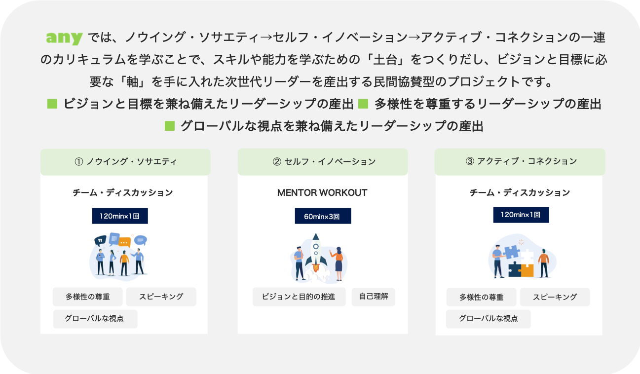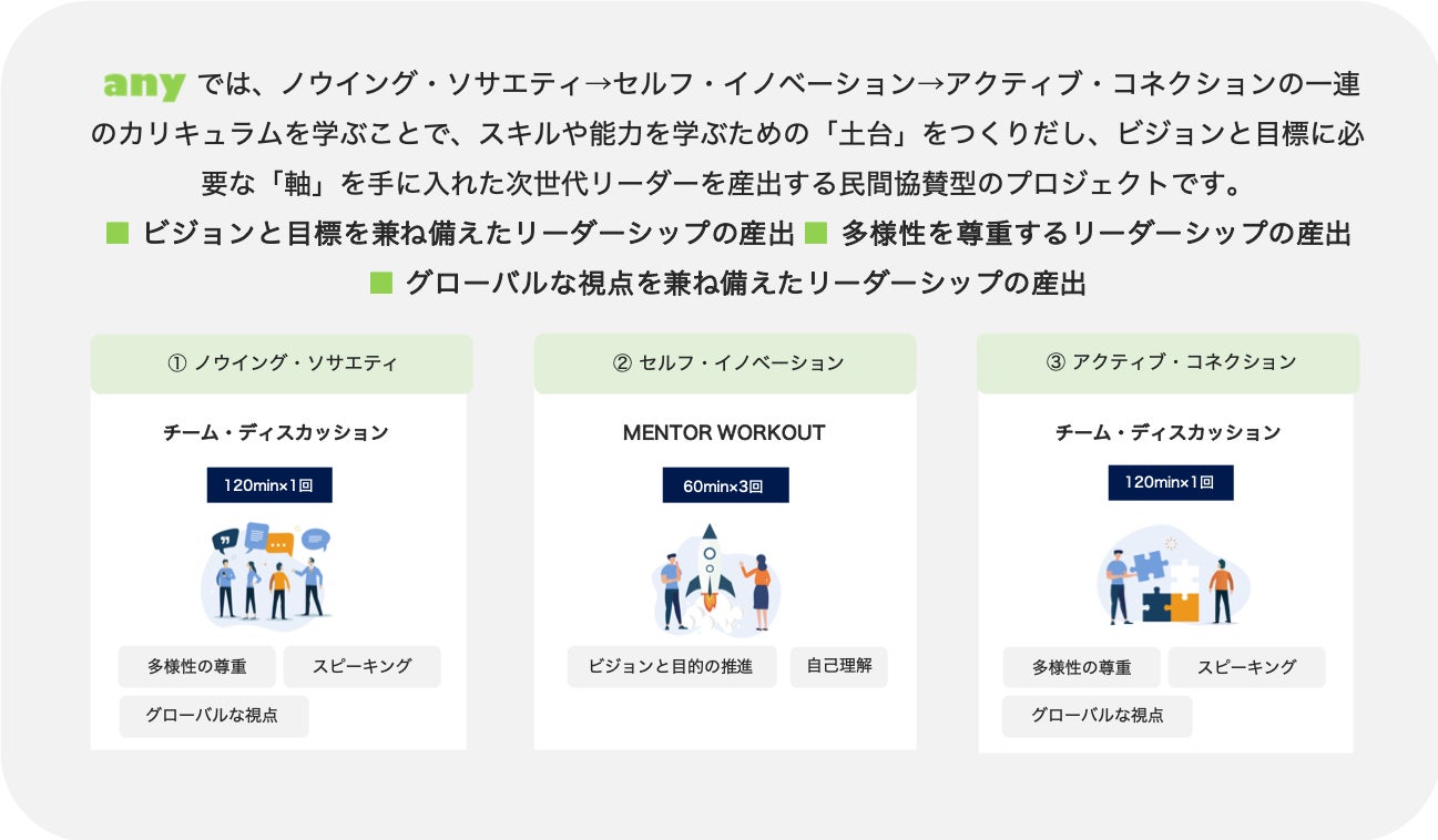 anyは、人が成長するための土台に着目し、多様な価値観のもとで、次世代の積極的なセルフ・イノベーションに取り組むことで、ビジョンと目標を兼ね備えたイノベーターの産出に貢献しています。