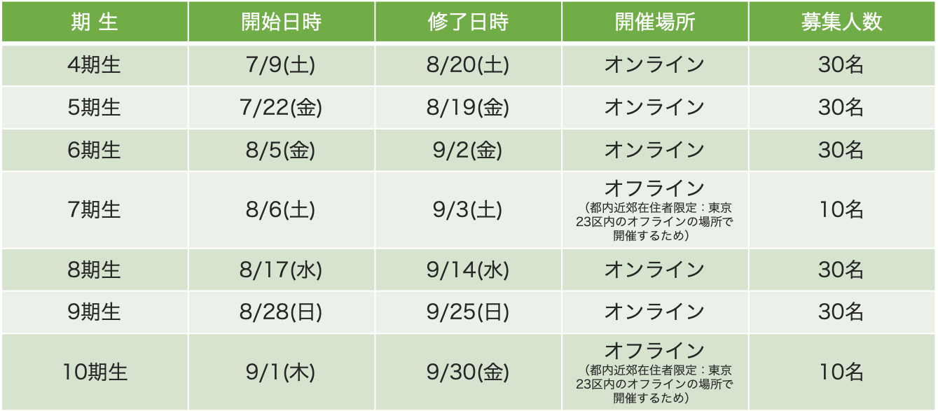 第7期生と第10期生に関しては、都内23区内の会議室で開催を予定しています。