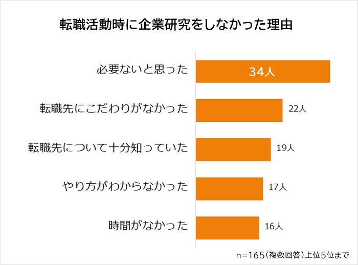 企業研究をしなかった理由1位は「必要ないと思った(34人)」。2位「転職先にこだわりがなかった(22人)」、3位「転職先について十分知っていた(19人)」と続きます。