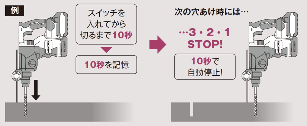 ご注意:穴あけ時間を記憶するもので、穴あけ深さを保証するものではありません。作業時の姿勢や機体の押しつけ力、被削材の違いやばらつきなどによって穴あけ深さが一定にならないことがあります。穴あけ深さのばらつきを少なくするには、デプスゲージを併用してください。