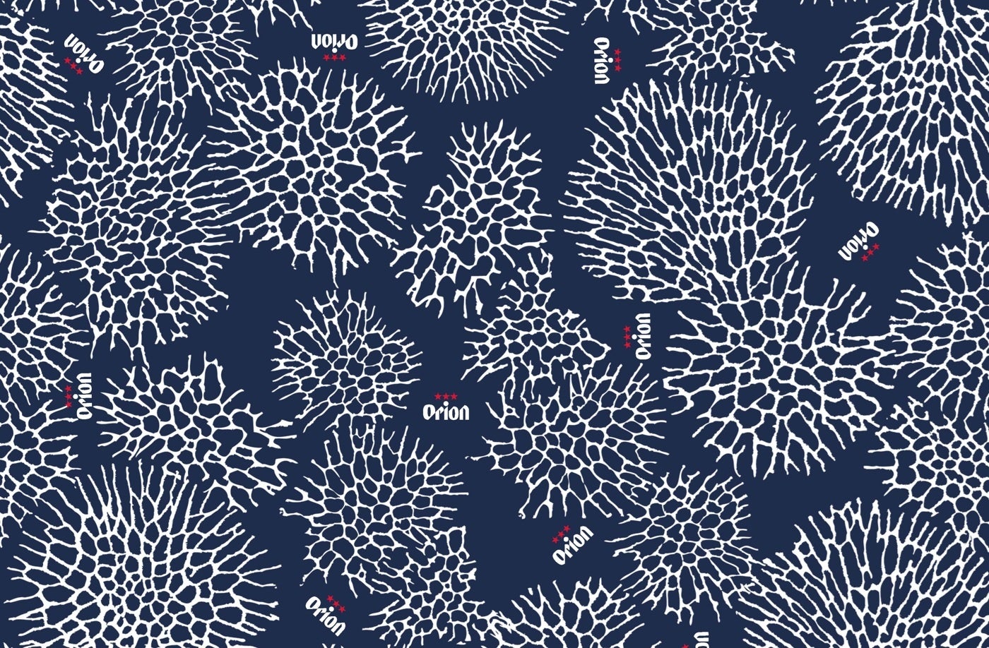 オンビール×首里琉染、地元、沖縄への想いが重なりコラボ実現。自然が産んだサンゴの模様を活かしたオリジナル生地を使用したアイテムをお届けします。