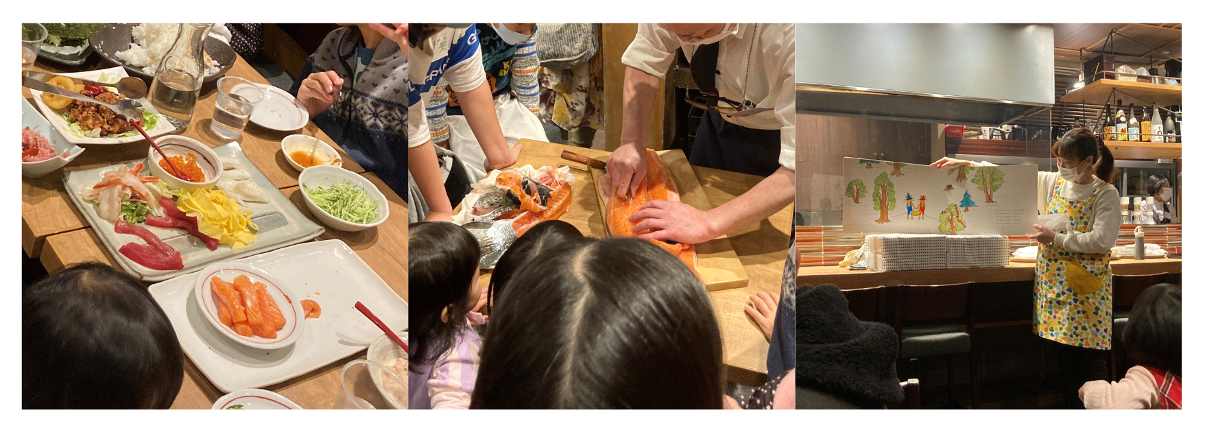 例「タコパ」:皆で生きたタコをさばき、たこ焼きを作り、食べ、たこ焼きが題材の絵本を読むパーティー。