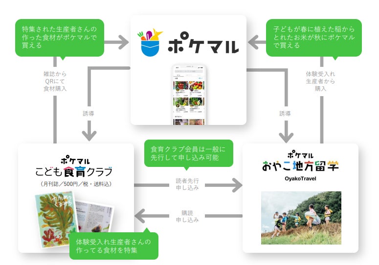 本サービスは、食べ物がどのように自然界で育ち、生産者が関わっているのか、親子で楽しく学べる月刊誌「こども食べるしんぶん」と、夏休みや冬休みに特集した生産者さんの元で自然体験ができる「ポケマルおやこ地方留学」が一体となったサービスです。