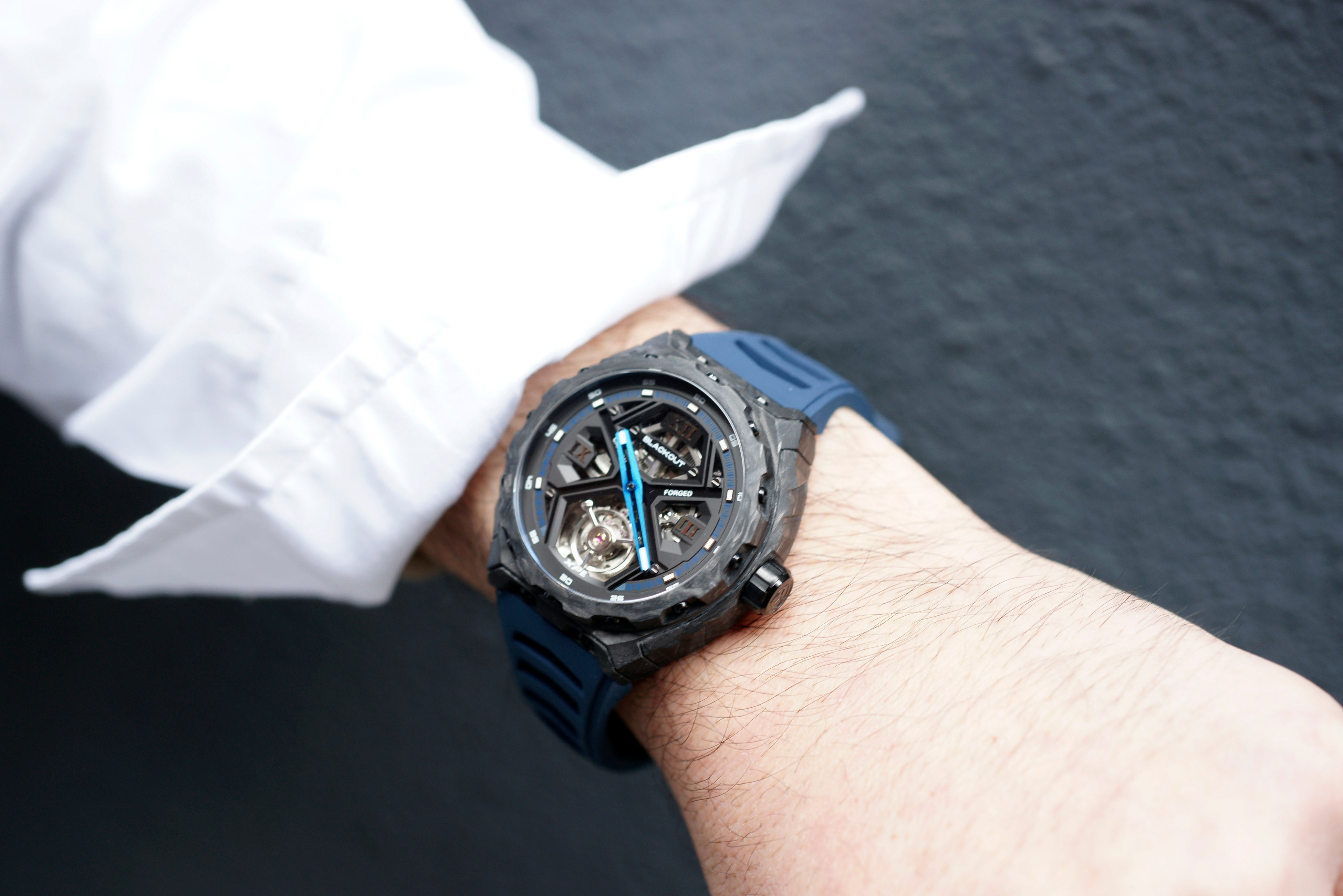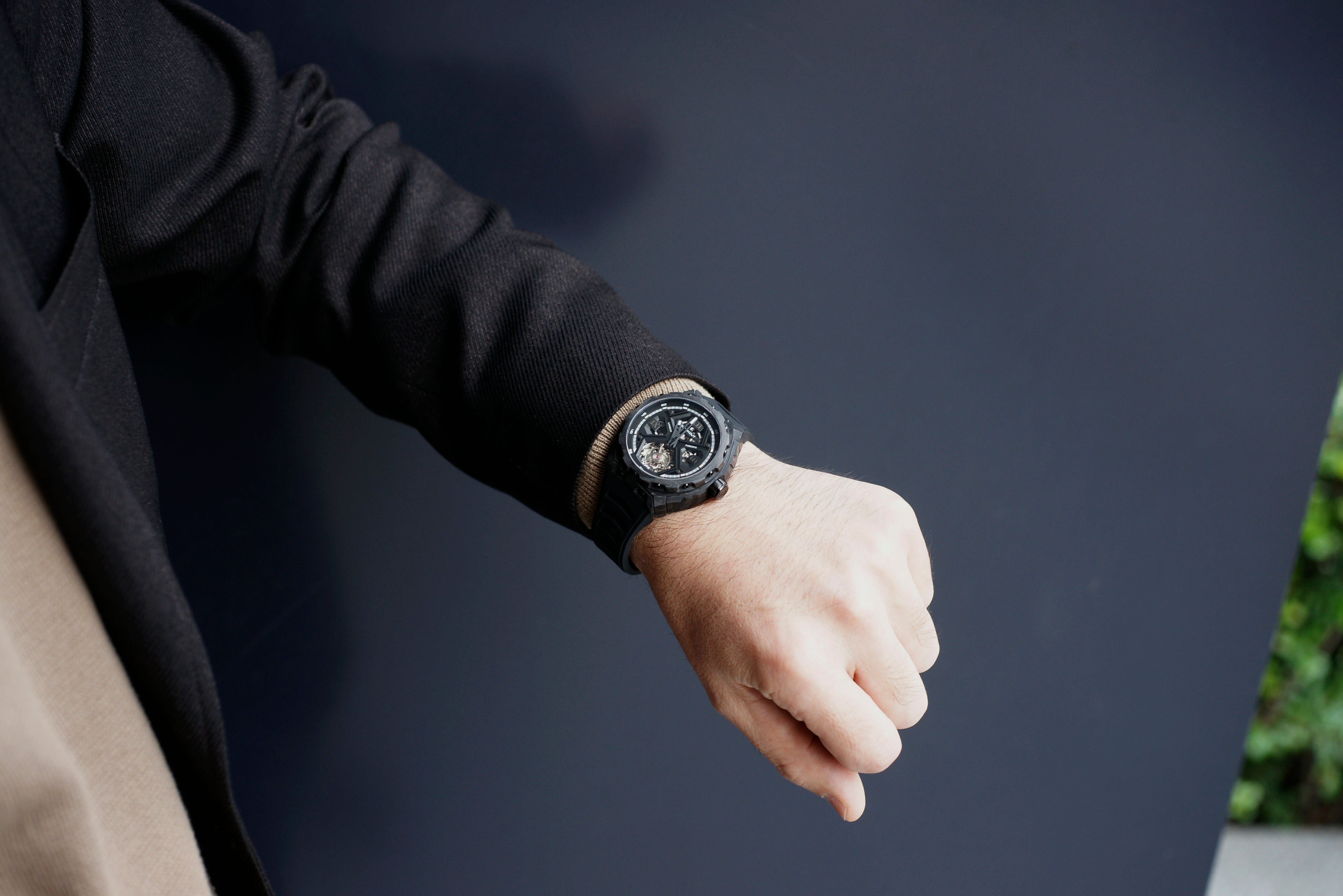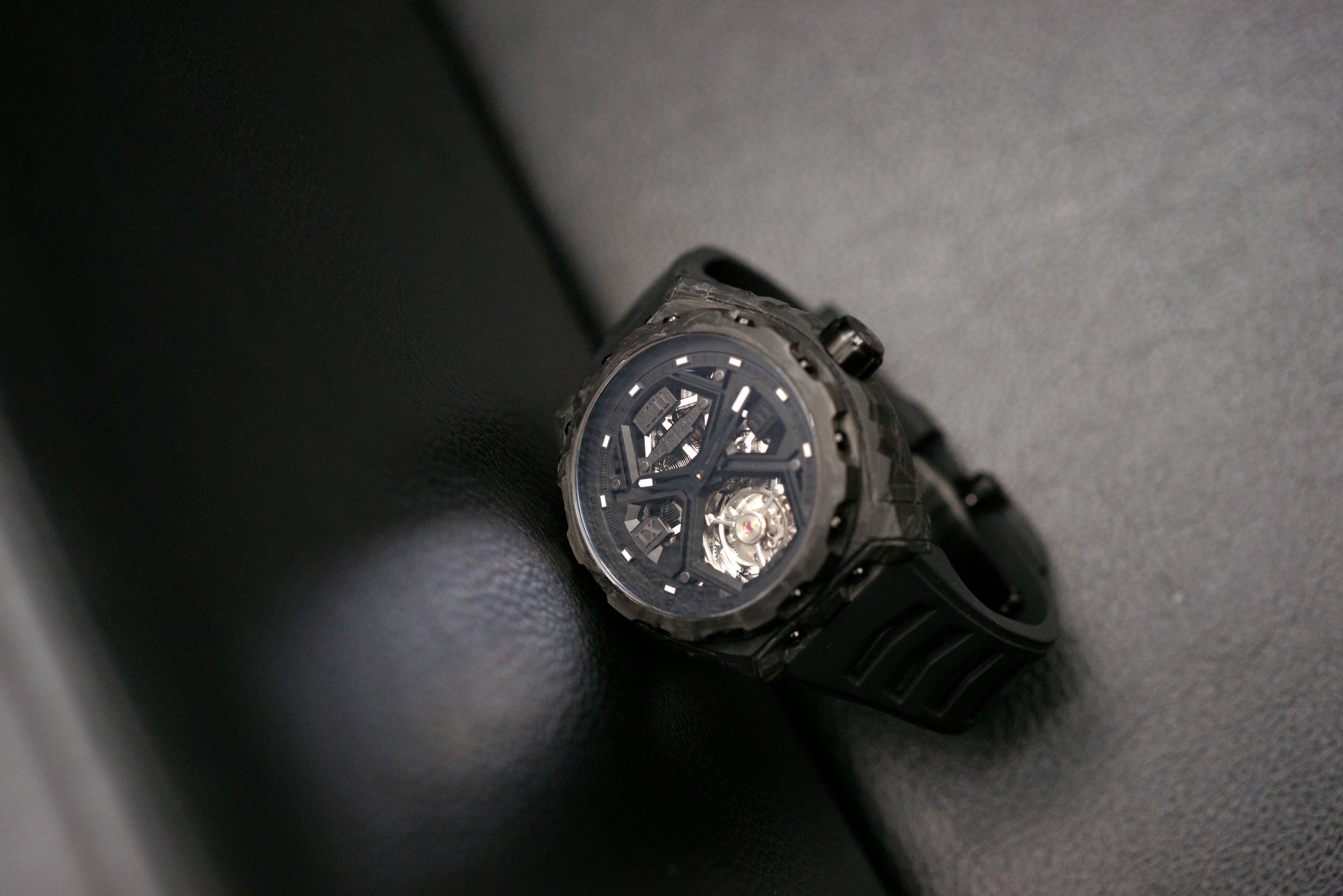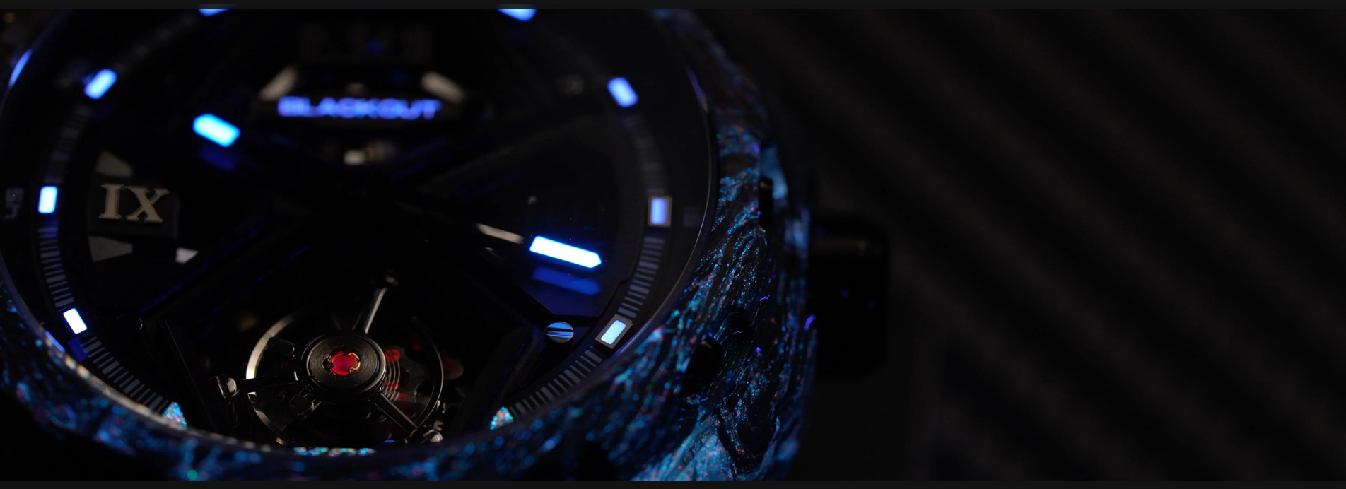 これまでのトノー型ケースとは異なり、ラウンド型ケースを採用することで、より幅広い時計愛好家にフィットするシルエットを実現しました。ケース素材には、UACフォージドカーボンを採用。高い耐久性と軽量性を両立し、時計全体の重量はわずか約80gに抑えられています。さらに、鍛造工程においてルミノバパウダーをカーボンに混合することで、太陽光や強い紫外線を照射され光を蓄えると暗闇で幻想的に白色発光するルミネッセント・フォージドカーボンを実現しました。サイズは直径42.5mm、厚さ14.8mmで、存在感と装着性のバランスに優れています。
