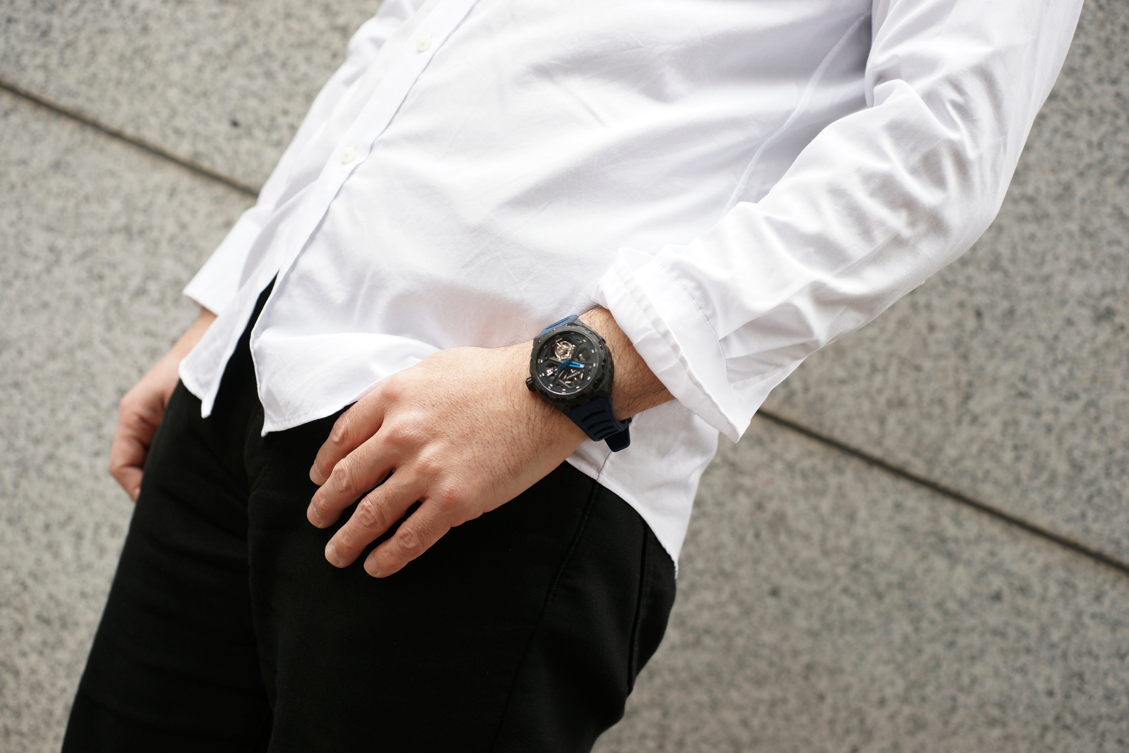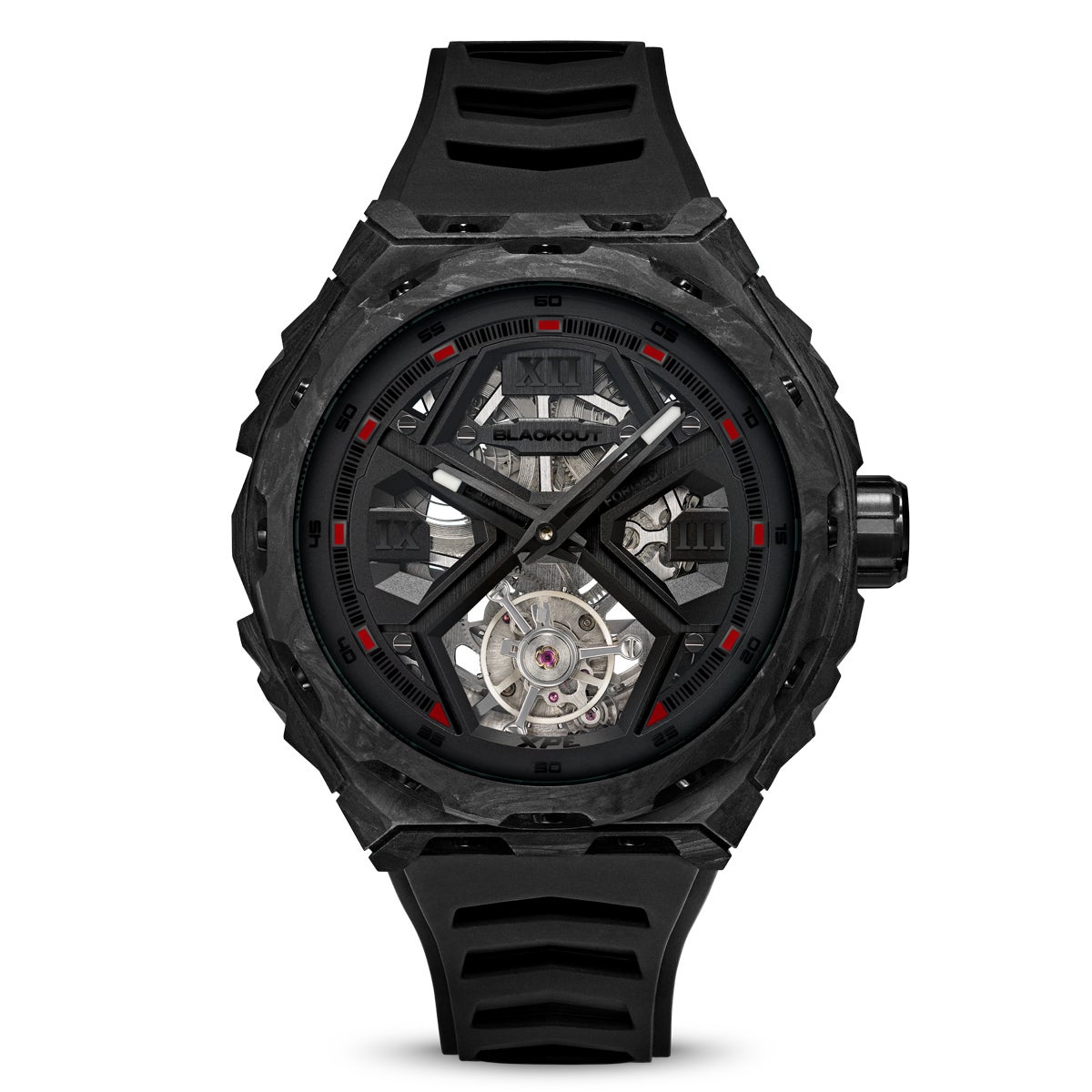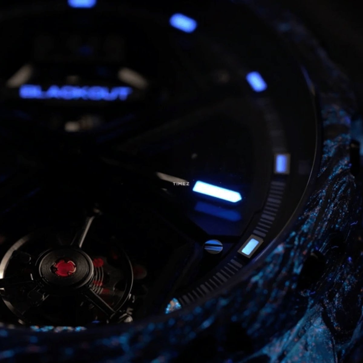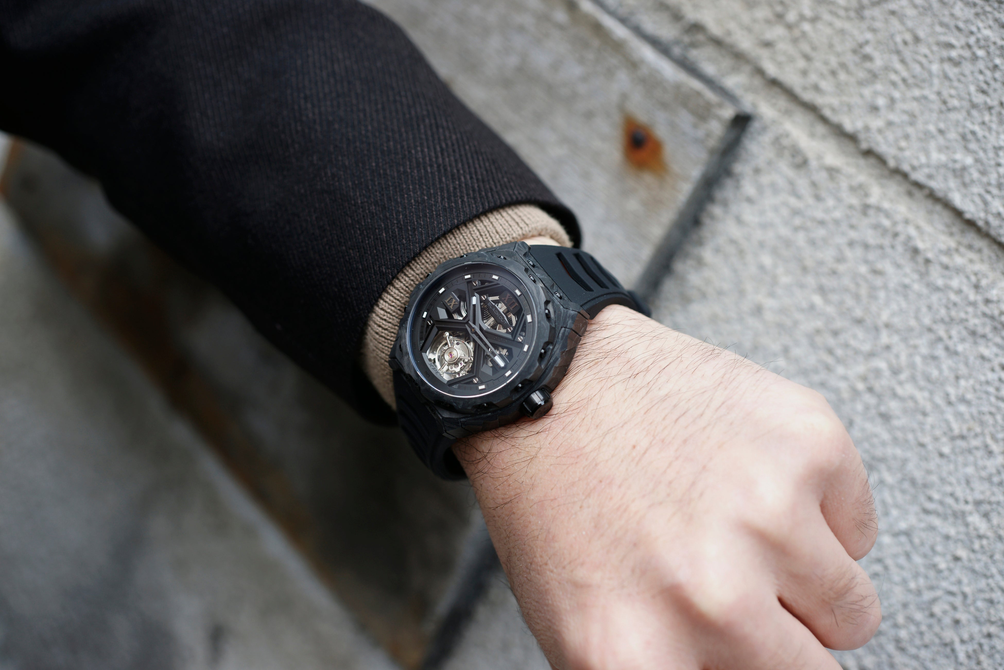 これまでのトノー型ケースとは異なり、ラウンド型ケースを採用することで、より幅広い時計愛好家にフィットするシルエットを実現しました。ケース素材には、UACフォージドカーボンを採用。高い耐久性と軽量性を両立し、時計全体の重量はわずか約80gに抑えられています。さらに、鍛造工程においてルミノバパウダーをカーボンに混合することで、太陽光や強い紫外線を照射され光を蓄えると暗闇で幻想的に白色発光するルミネッセント・フォージドカーボンを実現しました。サイズは直径42.5mm、厚さ14.8mmで、存在感と装着性のバランスに優れています。