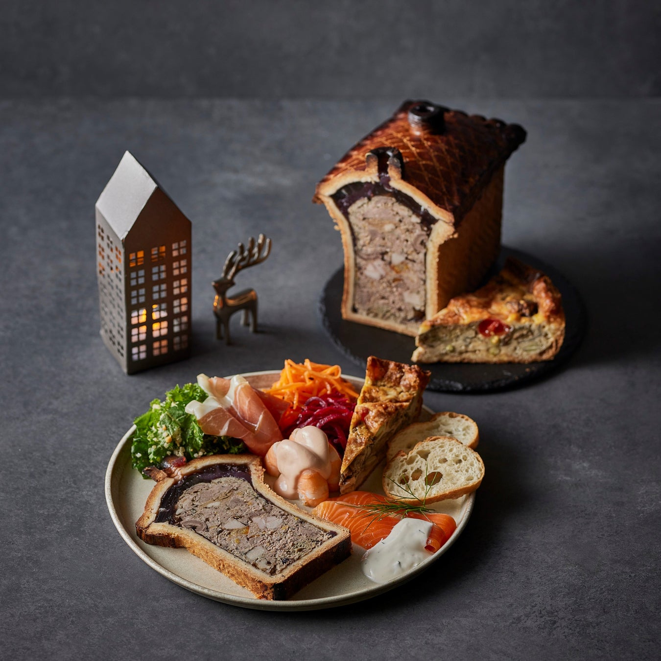 Ataが贈るクリスマスディナーセットです。メインは伝統的なフランス料理のパテ・アンクルートで、豚肉、鴨肉などを使ったパテを可愛らしいお家の形のパイで包み焼きにしています。その他、生ハムやキッシュ、エビのオーロラソースがけなど、クリスマスの夜にぴったりのデリはすべて2名分。フランスの伝統とクリスマスの温もりが溶け合う特別なプレートを大切な人と一緒にどうぞ。