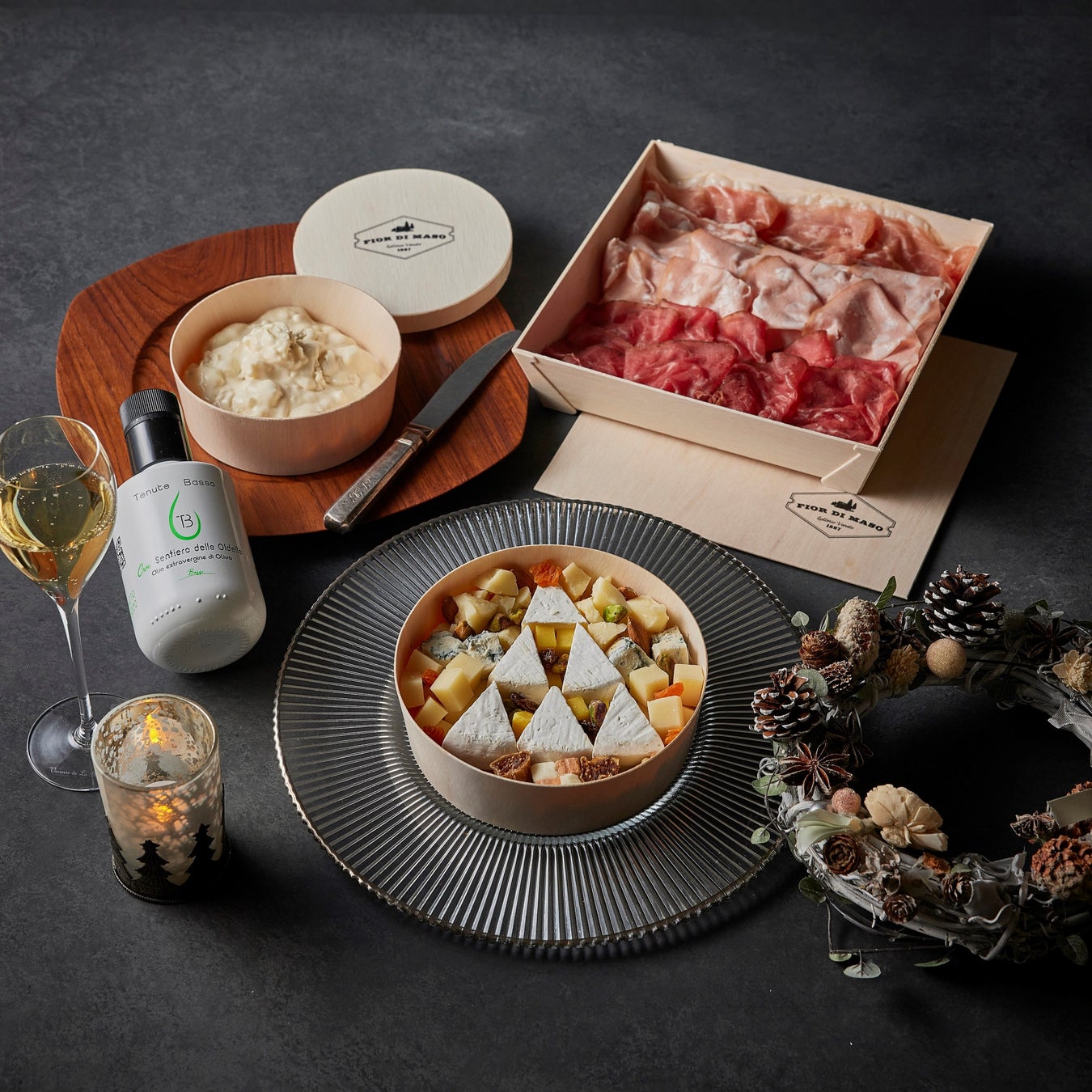 クリスマスパーティーのテーブルが華やかになる生ハムとチーズのセット。ハム3種盛り合わせ、チーズアソートメディオサイズ、ゴルゴンゾーラドルチェ200g、オリーブオイルをオリジナル保冷バックに入れてお渡しいたします。