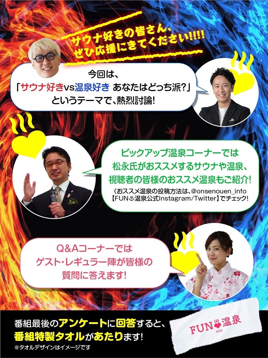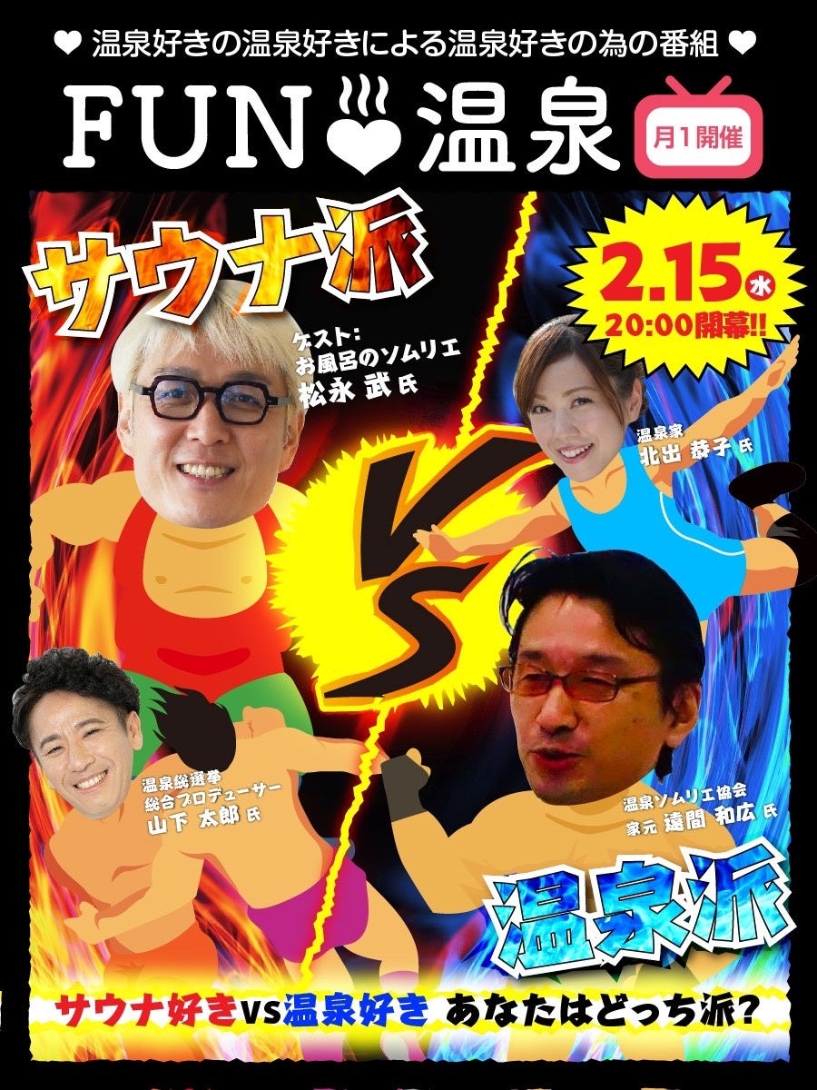 温泉VSサウナ!!絶対に負けられない戦いにお風呂のソムリエ松永武が初参戦!「FUN温泉」第9回が2月15日(水)20:00より開催決定!
