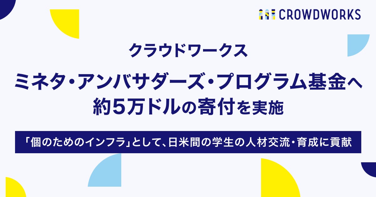 株式会社クラウドワークス(本社:東京都渋谷区 代表取締役社長 兼 CEO:吉田 浩一郎 以下「当社」)は、日米両国の学生の相互交流を推進する「ミネタ・アンバサダーズ・プログラム(以下「同プログラム」)」に約5万ドルの支援を行います。