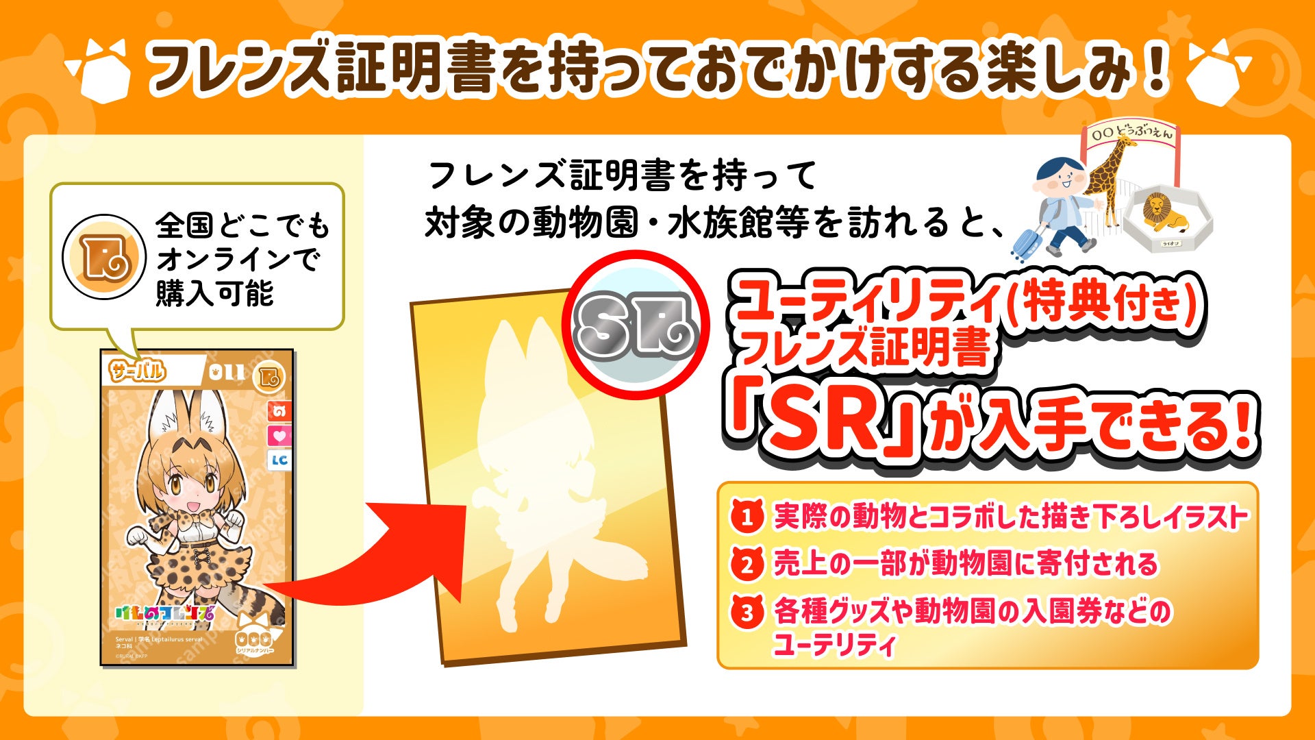 ユーザーは、「R」ランクのフレンズ証明書をオンラインで取得し、該当するキャラクターがいる動物園・水族館におでかけして、「SR」ランクをオフラインで購入することで、リアルでキャラクターを育成する体験を得られます。