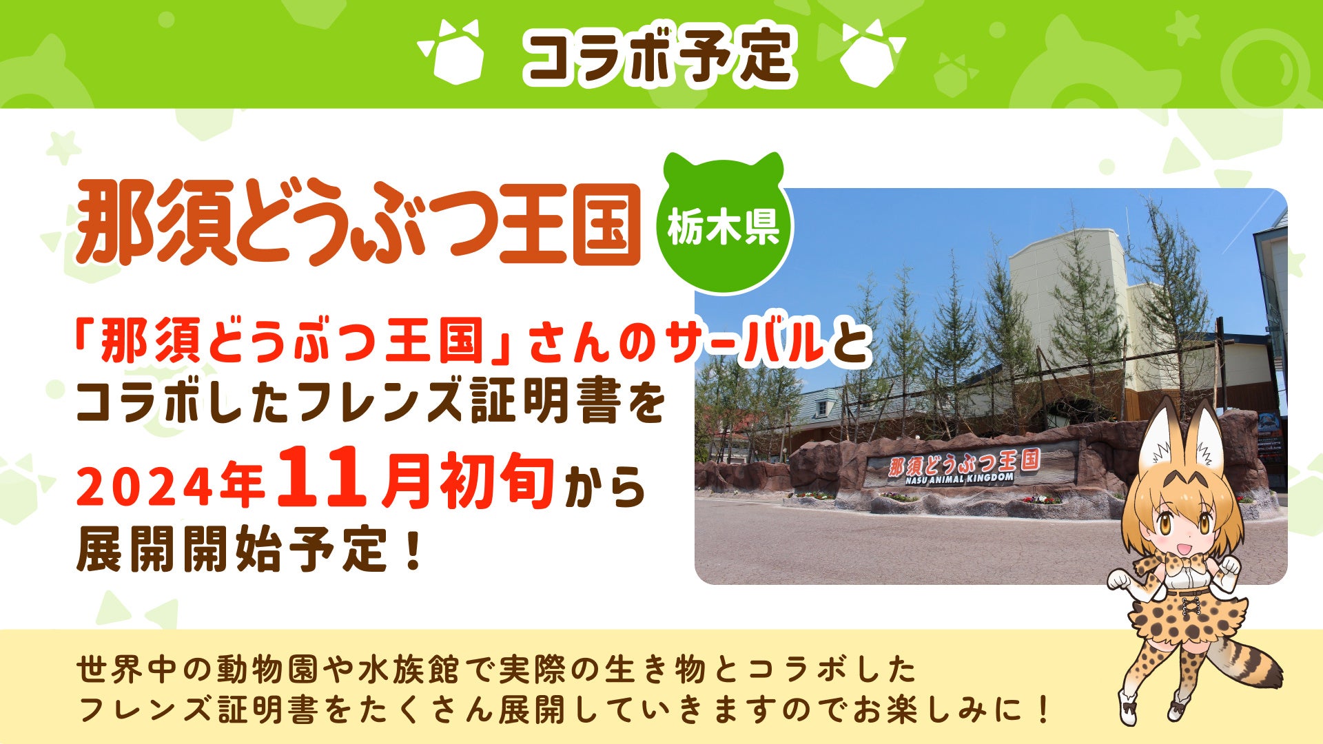 けものフレンズDiaryは、メインキャラクターのサーバルがいる那須どうぶつ王国を皮切りに、全国各地の動物園・水族館との提携を増やしていきます。