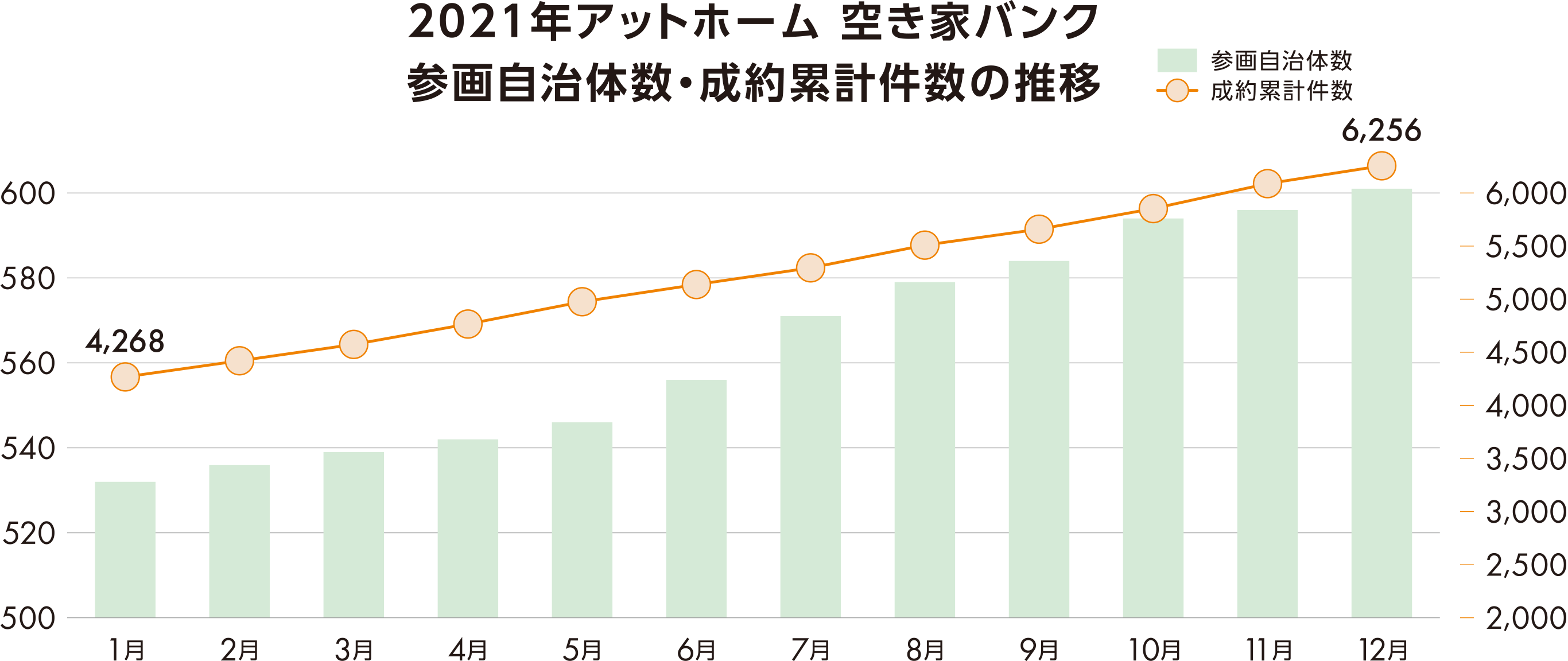 【2021年 「アットホーム 空き家バンク」の動き (参画自治体数・成約累計件数の推移)】