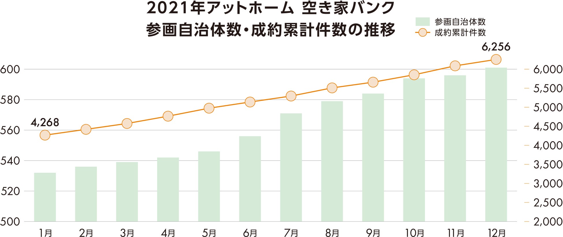 これらの施策により、2021年12月末には参画自治体数が600を超え、全国1,700超の自治体のうち、約3分の1が参画するサイトに成長しました。また、これまでに「空き家バンク」へ公開された物件について、その成約数(自治体より成約処理された数)が累計で6,000件を超えるなど、空き家等のマッチング支援を促進しています。