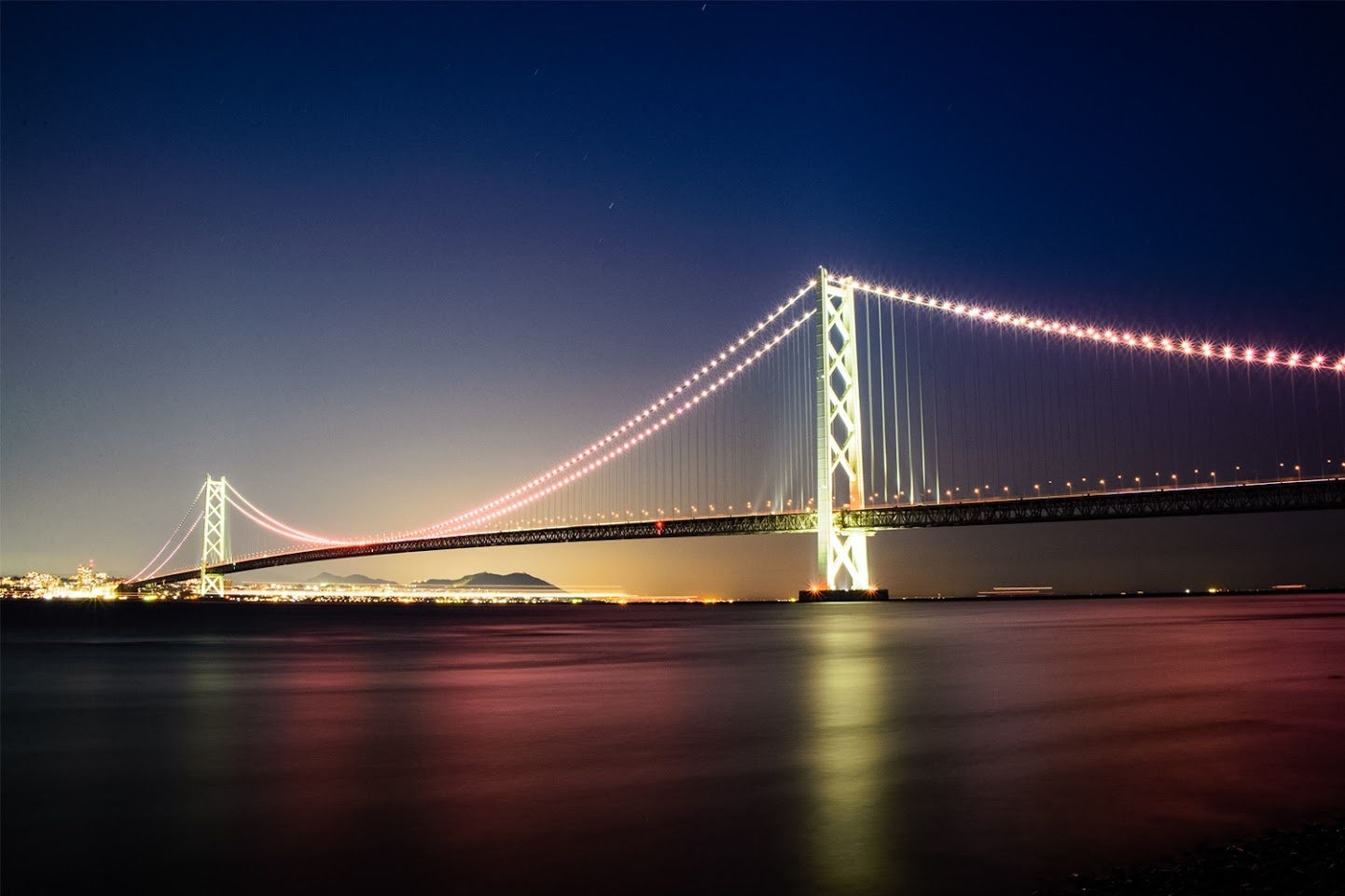 また明石海峡大橋は、パールブリッジと別名のあるように真珠を連ねたような美しいライトアップは色の組み合わせが28パターンもあり、季節によって色が変わり、異なる夜景をお楽しみ頂けます。